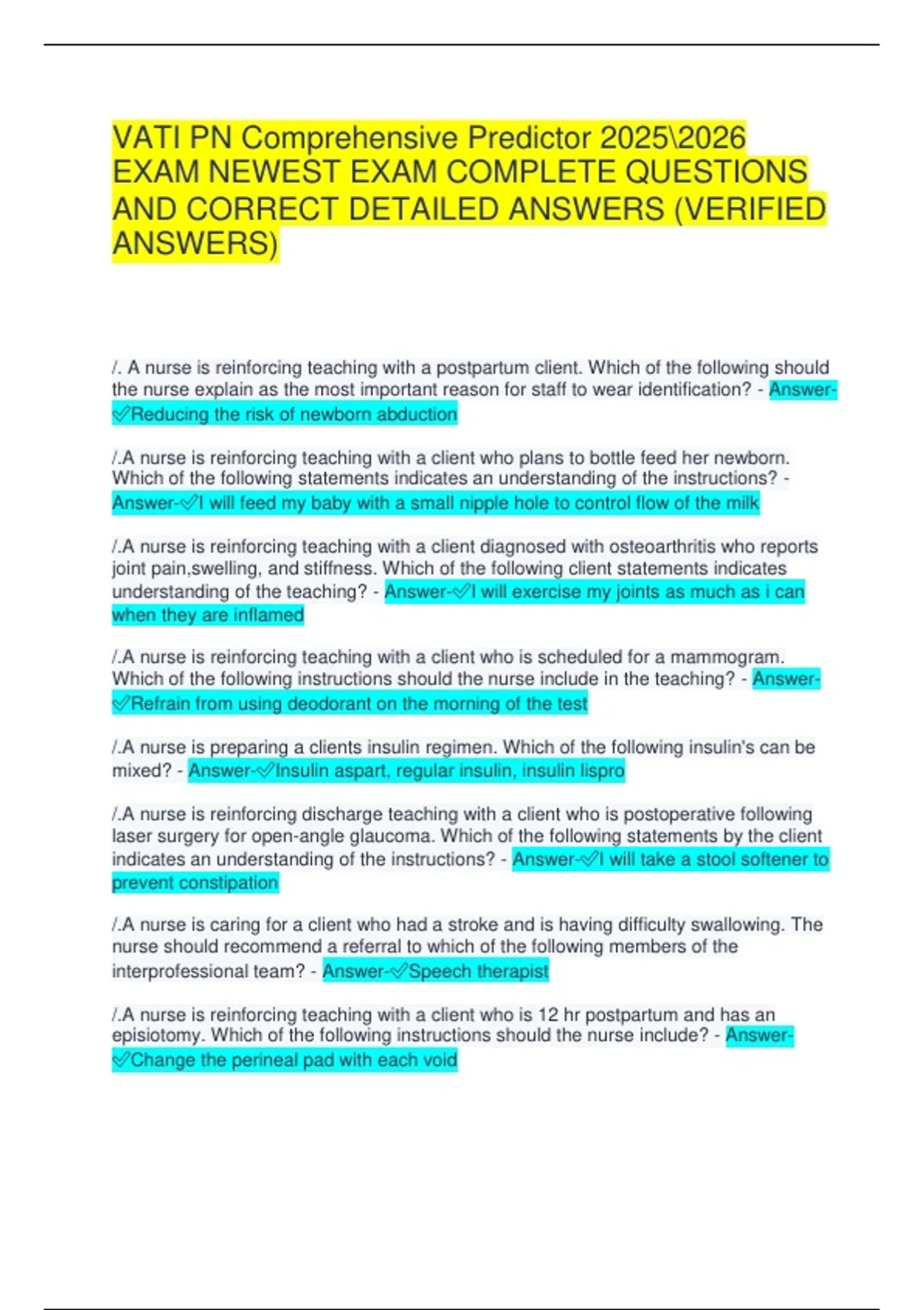 VATI PN Comprehensive Predictor EXAM NEWEST EXAM COMPLETE QUESTIONS AND CORRECT DETAILED ANSWERS (VERIFIED ANSWERS) /. A nurse is reinforcing teaching with a postpartum client. Which of the following should the nurse explain as the most important reason for staff to wear identification? - Answer-Reducing the risk of newborn abduction /.A nurse is reinforcing teaching with a client who plans to bottle feed her newborn. Which of the following statements indicates an understanding of the instructions? - Answer-I will feed my baby with a small nipple hole to control flow of the milk /.A nurse is reinforcing teaching with a client diagnosed with osteoarthritis who reports joint pain,swelling, and stiffness. Which of the following client statements indicates understanding of the teaching? - Answer-I will exercise my joints as much as i can when they are inflamed /.A nurse is reinforcing teaching with a client who is scheduled for a mammogram. Which of the following instructions should the nurse include in the teaching? - Answer-Refrain from using deodorant on the morning of the test /.A nurse is preparing a clients insulin regimen. Which of the following insulin's can be mixed? - Answer-Insulin aspart, regular insulin, insulin lispro /.A nurse is reinforcing discharge teaching with a client who is postoperative following laser surgery for open-angle glaucoma. Which of the following statements by the client indicates an understanding of the instructions? - Answer-I will take a stool softener to prevent constipation /.A nurse is caring for a client who had a stroke and is having difficulty swallowing. The nurse should recommend a referral to which of the following members of the interprofessional team? - Answer-Speech therapist /.A nurse is reinforcing teaching with a client who is 12 hr postpartum and has an episiotomy. Which of the following instructions should the nurse include? - Answer-Change the perineal pad with each void /.A nurse is collecting data from a child who has acute Glomerulonephritis. Which of the following findings should the nurse expect? - Answer-Periorbital edema /.A nurse is preparing to administer a liquid medication to a 6-month-old infant who is crying. Which of the following actions should the nurse take to reduce the risk of aspiration? - Answer-Administer using a needless syringe in the buccal cavity /.A nurse is reinforcing teaching with a client who has peptic ulcer disease. Which of the following statements by the client indicates an understanding of the teaching? - Answer-I will plan to have my meals at regular intervals /.A nurse in long-term care facility has received change-of-shift report about four clients. Which of the following clients should the nurse attend to first? - Answer-A client who has COPD and dementia and was agitated during the night shift /.A nurse is collecting data from a client who has substance use disorder and reports recently taking opioids. Which of the following findings should the nurse identify as a manifestation of opioid intoxication? - Answer-Pinpoint pupils /.A nurse in a urgent care clinic is collecting data from a client who reports having diarrhea for the past 3 days. Which of the following findings indicates hypokalemia? - Answer-Muscle weakness /.A nurse is contributing to the discharge plans for four clients. The nurse should identify that which of the following clients requires an interdisciplinary care conference? - Answer-A client who has hemiparesis and lives alone /.A nurse is reinforcing teaching with an adolescent who has a new prescription for cefazolin. For which of the following findings should the nurse instruct the adolescent to monitor and report to the provider? - Answer-Depression /.A nurse is reinforcing teaching with a group of expectant parents regarding the proper use of a car seat. Which of the following statements by a parent indicates an understanding of the teaching? - Answer-I can place a rolled towel on each side of my newborns head until he can hold his head up /.A nurse is caring for a school-age child who has epistaxis. Which of them following actions should the nurse take? - Answer-Apply pressure at the bridge of the child's nose /.A nurse is caring for four clients. Which of the following clients statements should the nurse attend to first? - Answer-My heartburn pain is going into my jaw now /.A nurse in a providers office is talking on the phone with the parent of a school-age child who has varicella. - Answer-All vesicles have crusted over /.A nurse is collecting data from a client who hgb is 8.8 mg/dL. Which of the following statements should the nurse expect? - Answer-I feel tired all the time /.A nurse is administering a cleansing enema to a client who reports mild cramping during instillation of the solution. Which of the following actions should the nurse take? - Answer-Slow the rate of instillation /.A nurse receives report on four clients. The nurse should first collect data about the client who has which of the following? - Answer-A decreased level of consciousness and vomiting /.A nurse is setting up a sterile field prior to performing a dressing change. Which of the following actions should the nurse take? - Answer-Open the outermost flap of the wrapper toward the body /.A nurse is caring for a client who has bipolar disorder and is experiencing mania. Which of the following actions should the nurse take? - Answer-Frequently remind the client of the expectations for her behavior /.A nurse is caring for a client who has viral pneumonia. Which of the following actions should the nurse take? - Answer-Administer Azithromycin /.A nurse who orienting to a medical-surgical unit is having difficulty finishing client care tasks during his shift. Which of the following suggestions should the nurse's preceptor make to help the nurse with time management? - Answer-Try to complete a task before moving on to the next. /.A nurse is caring for an older adult client who is postoperative following a