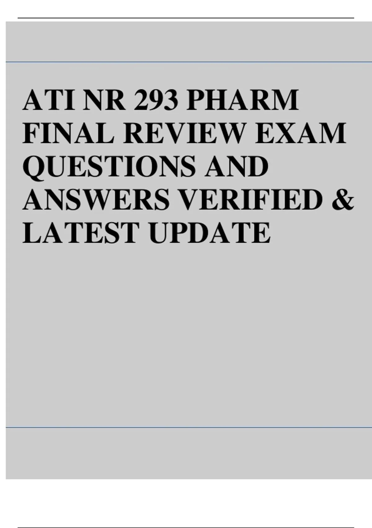 This document contains the complete ATI NR293 Pharmacology Final Review Exam with verified and up-to-date questions and answers, reflecting the latest ATI and nursing curriculum standards. It covers all major drug categories and clinical applications, including cardiovascular, neurological, endocrine, antimicrobial, and pain management medications, as well as dosage calculations, side effects, contraindications, and nursing considerations. Perfect for nursing students preparing for the ATI Pharmacology Final, HESI, or NCLEX-RN exams.