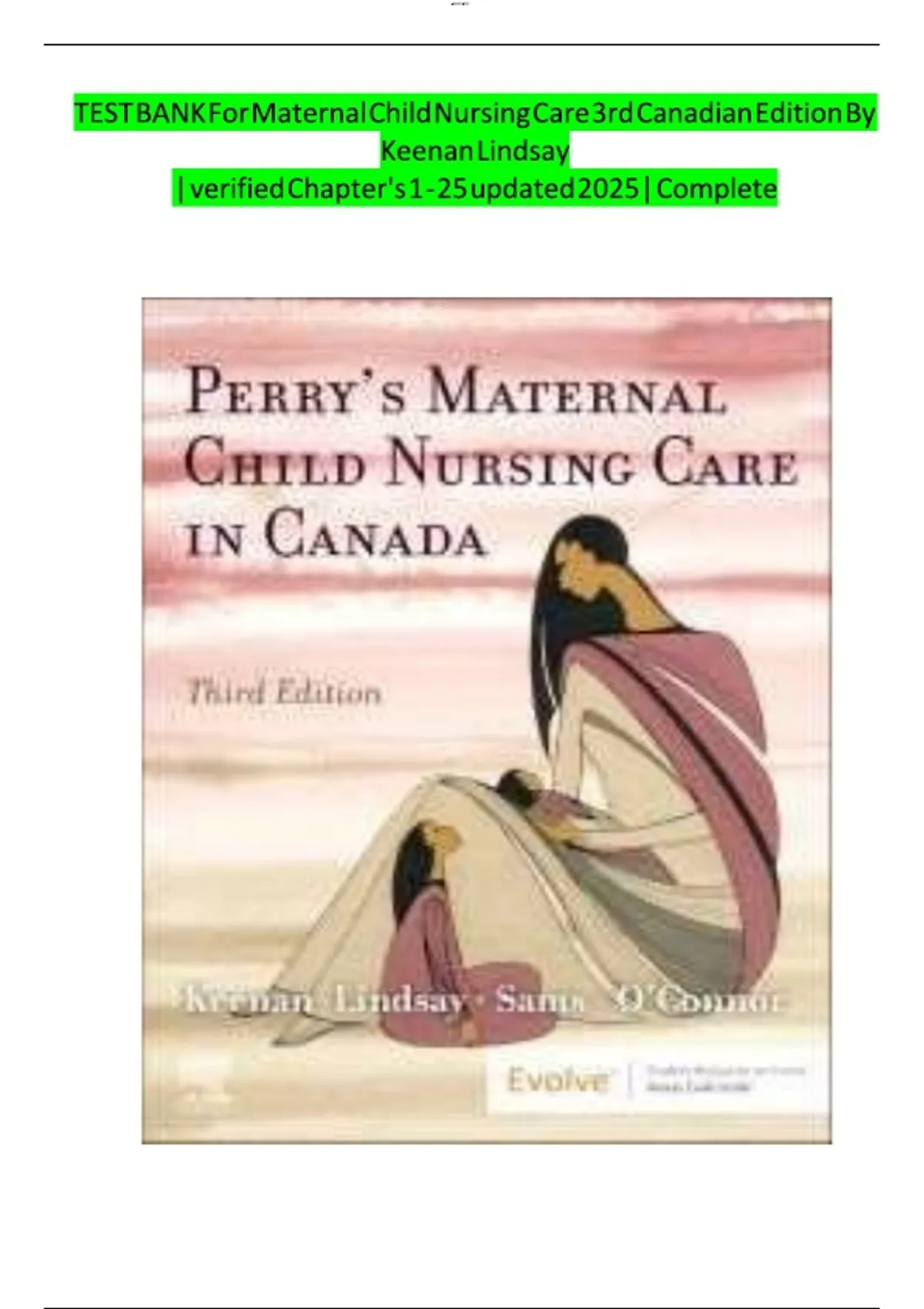 This is a complete test bank for the textbook Perry's Maternal Child Nursing Care in Canada, Third Edition. It is a resource, reportedly verified and updated for 2025, that contains multiple-choice questions for all 25 chapters. The questions cover topics related to contemporary perinatal and pediatric nursing in Canada.