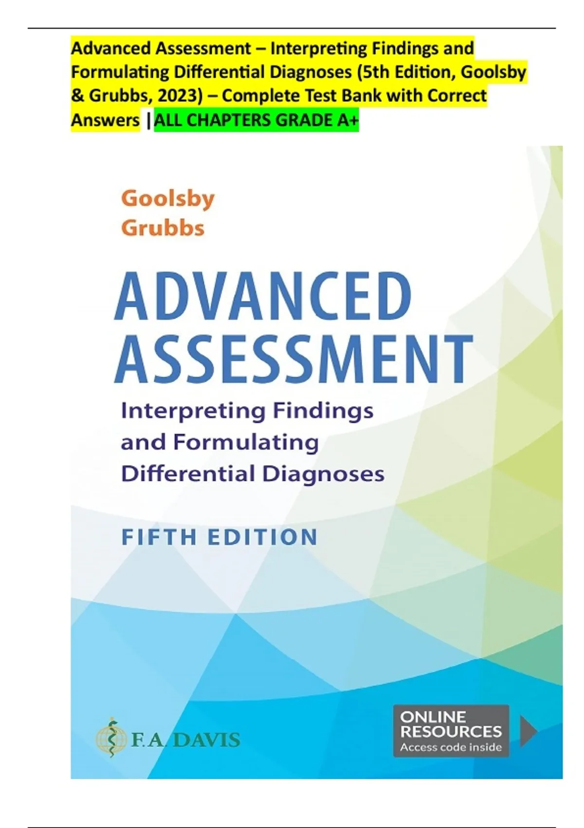 Advanced Assessment – Interpreting Findings and Formulating Differential Diagnoses (5th Edition, Goolsby & Grubbs, 2023) – Complete Test Bank with Correct Answers. This document contains a comprehensive test bank for Advanced Assessment: Interpreting Findings and Formulating Differential Diagnoses (5th Edition) by Mary Jo Goolsby and Laurie Grubbs. It includes multiple-choice questions and detailed answer keys from multiple chapters, such as assessment and clinical decision-making, genetic assessment, dermatological evaluation, and head, face, and neck examinations. Each question is followed by a rationale, making it highly useful for exam preparation or in-depth review. Ideal for students and nurse practitioners preparing for advanced clinical assessments and differential diagnosis exams. Fully aligned with the latest edition of the textbook and clinical guidelines.