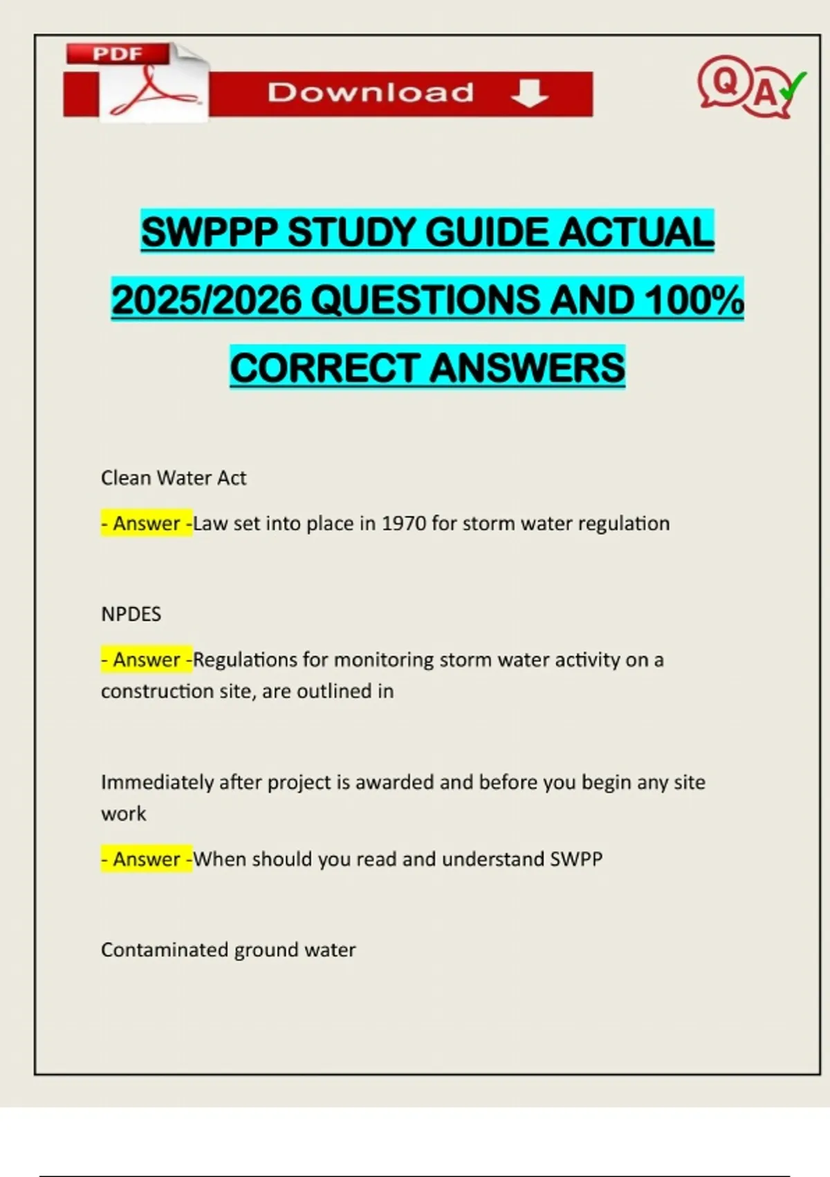 SWPPP STUDY GUIDE ACTUAL 2025/2026 QUESTIONS AND 100% CORRECT ANSWERS