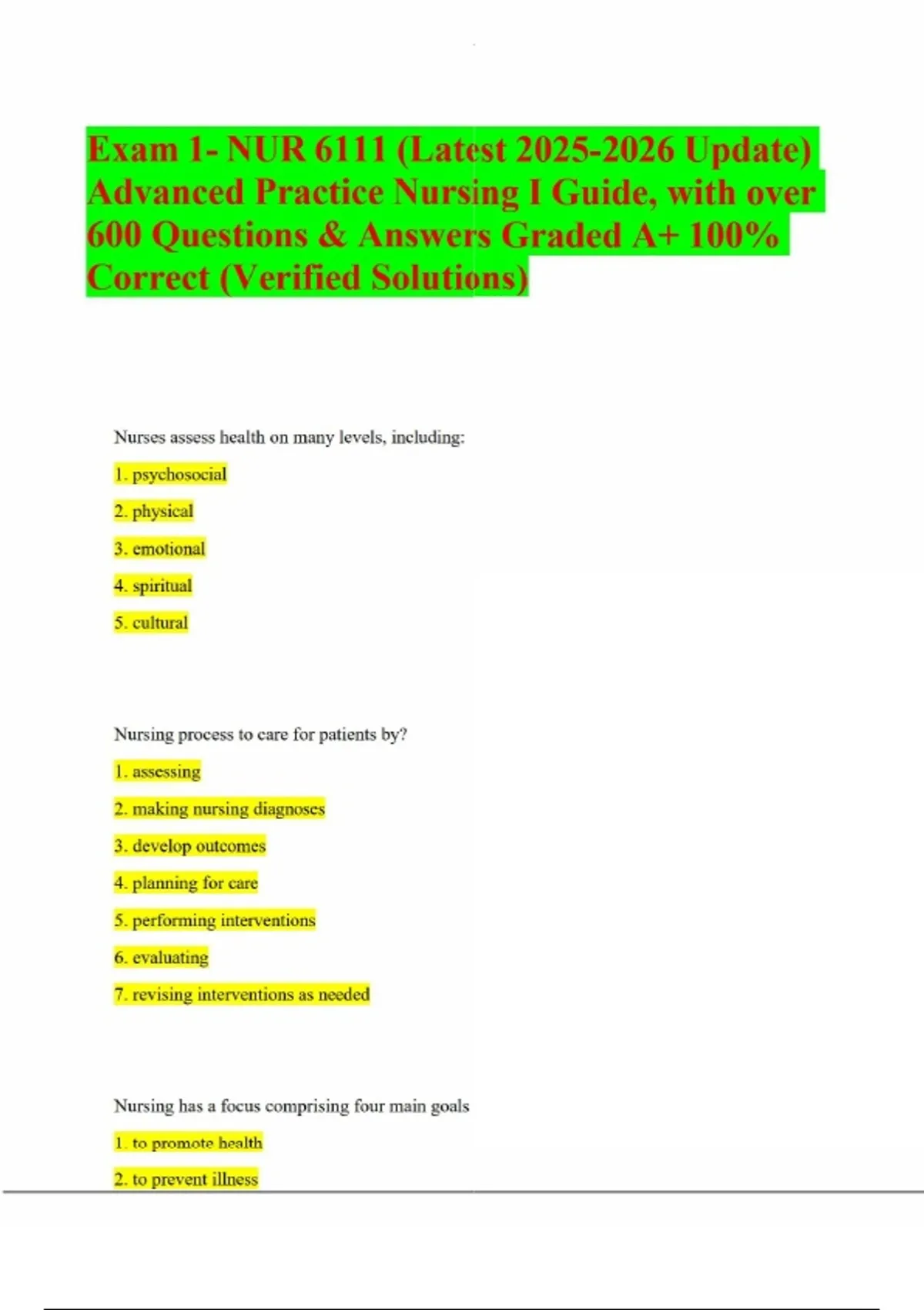 Exam 1- NUR 6111 (Latest Update) Advanced Practice Nursing I Guide, with over 600 Questions & Answers Graded A+ 100- Correct (Verified Solutions).pdf Exam 1- NUR 6111 (Latest Update) Advanced Practice Nursing I Guide, with over 600 Questions & Answers Graded A+ 100- Correct (Verified Solutions).pdf Exam 1- NUR 6111 (Latest Update) Advanced Practice Nursing I Guide, with over 600 Questions & Answers Graded A+ 100- Correct (Verified Solutions).pdf