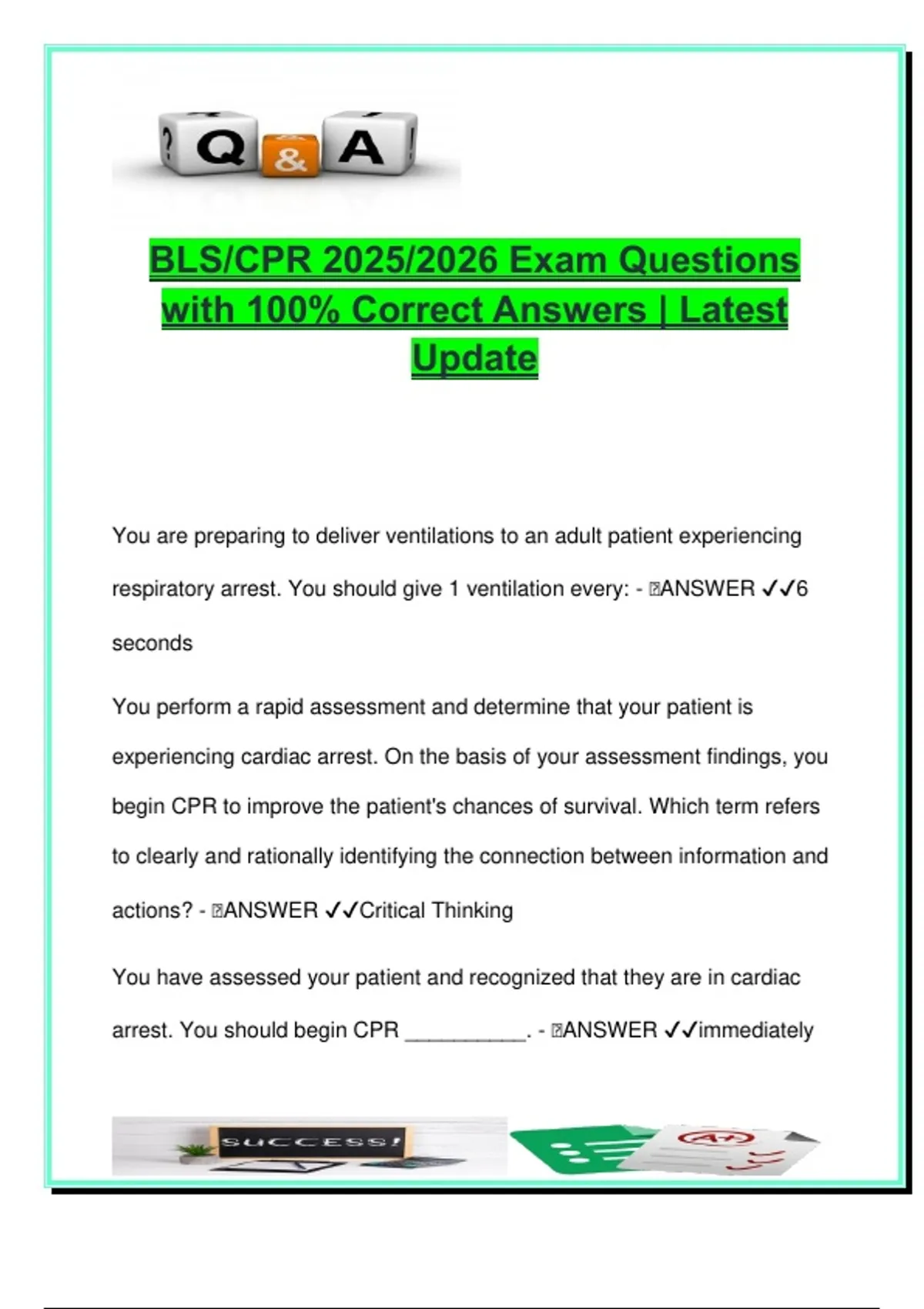 This document features 28 expertly crafted BLS/CPR exam questions and 100% correct answers, designed for the 2025/2026 certification period. It focuses on real-life clinical scenarios and provides complete alignment with the latest Basic Life Support (BLS) and American Heart Association (AHA) guidelines. The content is ideal for both written exam preparation and hands-on skills assessments. Key topics include: CPR techniques for all age groups: adult, child, and infant—covering compression depths, rates, and ventilation timing Team dynamics and communication in a resuscitation setting, including closed-loop communication and role delegation Special cases such as pregnancy-related cardiac arrest, opioid overdose, and endotracheal tube ventilation protocols Airway management techniques, including the jaw-thrust maneuver for suspected spinal injuries Choking protocols, compression-to-ventilation ratios, BVM use, AED application, and post-ROSC monitoring Standards for switching providers during CPR, checking for responsiveness, and minimizing pauses in compressions This study guide is particularly valuable for: Courses: Nursing, EMT, Paramedic Training, Medical Assisting, Respiratory Therapy, Pre-Med, Physician Assistant (PA), and First Responder programs Students: Nursing students, EMT trainees, new healthcare workers, and clinical interns preparing for BLS certification or recertification Written with scenario-based clarity and technical precision, this resource ensures learners understand not only what to do, but why it’s done—essential for test success and confident emergency care. Keywords: BLS CPR 2025, pediatric CPR, adult CPR, ventilation rate, compression depth, opioid overdose, naloxone, team leader, jaw-thrust, airway management, AED use, choking relief, high-quality CPR, closed-loop communication, healthcare certification