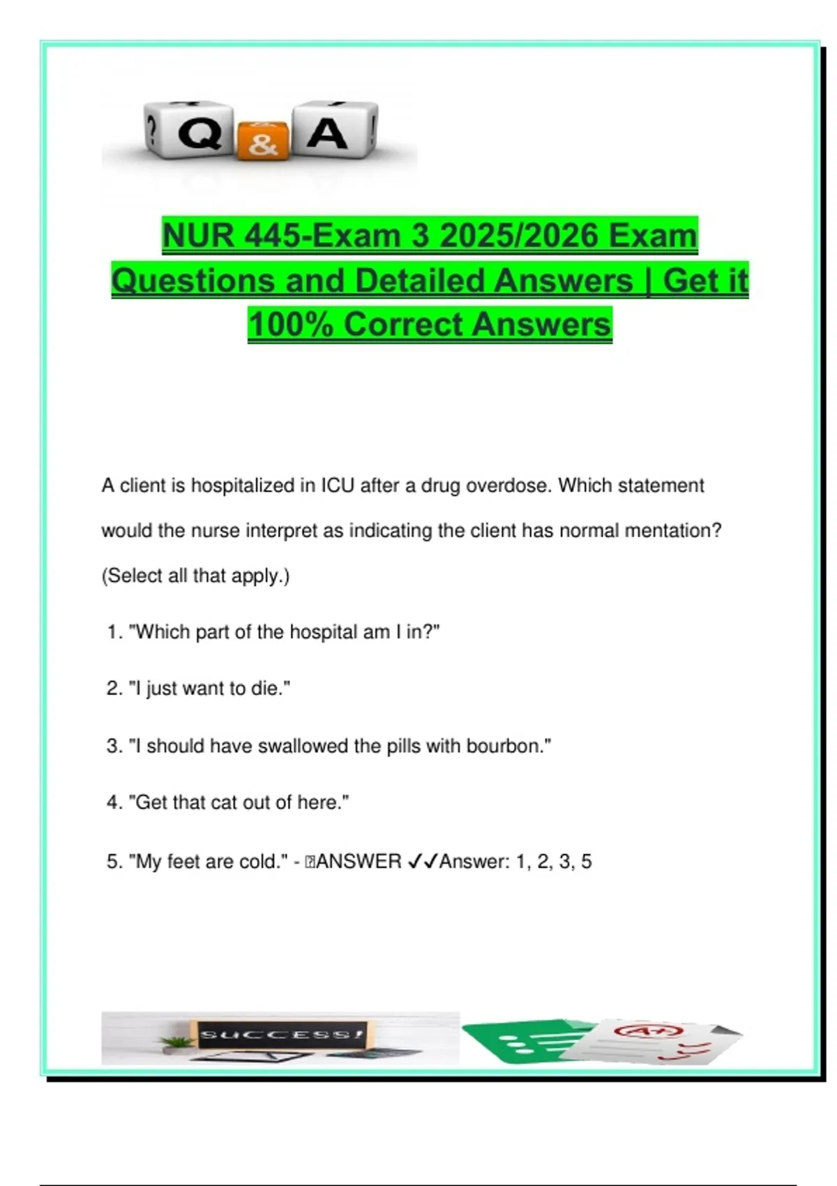 This document provides a complete and detailed question-and-answer study guide for NUR 445 Exam 3 – Nursing in Complex Health Systems, specifically tailored for the 2025/2026 academic year at the University of Phoenix. It contains 100 high-yield clinical questions and accurate answers covering essential medical-surgical and critical care nursing topics, with a strong focus on neurological disorders, trauma, and endocrine emergencies. Major topics include: Acute stroke care, ischemic and hemorrhagic events, tPA protocols, and nursing priorities Traumatic brain injury (TBI), including concussions, hematomas, intracranial pressure (ICP) management, and Glasgow Coma Scale assessment Spinal cord injuries, syndromes (e.g., Brown-Séquard), neurogenic shock, and autonomic dysreflexia Seizures, delirium vs. dementia, and ICU-level neurological interventions Diabetes-related crises, including diabetic ketoacidosis (DKA) and hyperglycemic hyperosmolar state (HHS) GI complications, liver failure, pancreatitis, burn care, and trauma-related assessments Every answer includes clinical context to reinforce critical thinking and evidence-based practice. This resource is highly beneficial for: BSN and ADN nursing students preparing for midterms or finals Students in accelerated or RN-to-BSN programs NCLEX-RN candidates Medical-surgical, critical care, and emergency nursing learners It is also suitable for those in courses related to adult health, pathophysiology, critical care, and nursing assessment, looking for an efficient way to review complex systems and acute care scenarios. Keywords: nursing exam review, stroke management, spinal cord injury, traumatic brain injury, neuro ICU nursing, diabetes complications, NCLEX questions, critical care nursing, DKA vs HHS, NUR 445 study guide