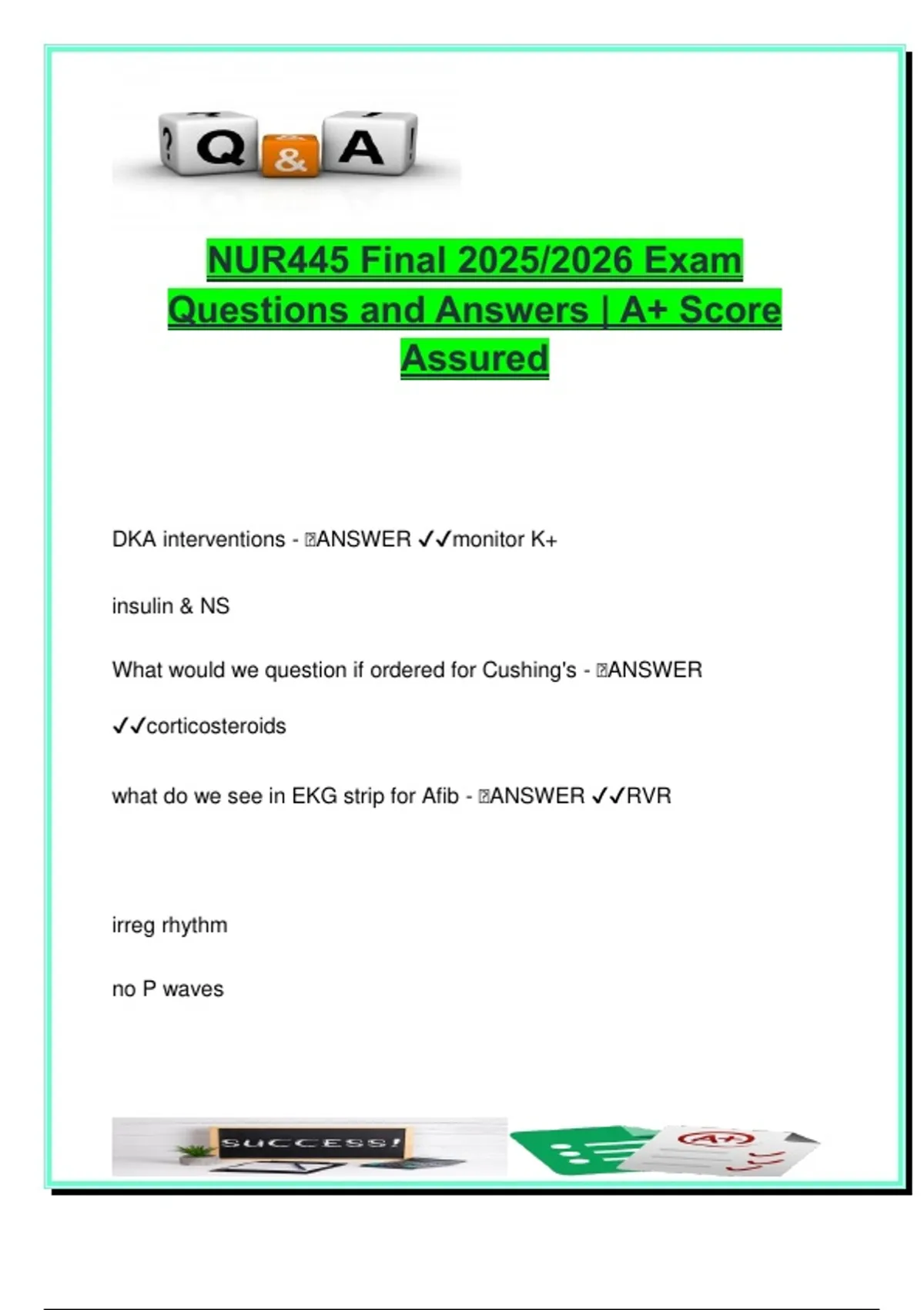 This comprehensive study guide for the NUR 445 Final Exam – Nursing in Complex Health Systems, includes 100 carefully reviewed questions and accurate answers, crafted for the 2025/2026 academic year at the University of Phoenix. It is designed to help students master complex clinical scenarios commonly encountered in critical care, med-surg, and emergency settings. Core topics include: Cardiac emergencies: atrial fibrillation (Afib), ventricular fibrillation (Vfib), myocardial infarction (MI), cardiogenic shock, cardiac tamponade, and Beck’s triad Respiratory and critical care: ARDS, ventilator-associated pneumonia (VAP), tension pneumothorax, and ventilator settings Endocrine crises: diabetic ketoacidosis (DKA), hyperosmolar hyperglycemic state (HHS), thyroid storm, myxedema coma, SIADH, and diabetes insipidus (DI) Renal and fluid balance: acute kidney injury (AKI), central venous pressure (CVP), and dialysis fistula assessment Neurologic and oncologic emergencies: stroke (TPA inclusion/exclusion), Guillain-Barré syndrome (GBS), spinal cord compression, leukostasis, tumor lysis syndrome (TLS), and superior vena cava syndrome Liver and GI conditions: hepatic encephalopathy, cirrhosis, and lactulose therapy Shock states: septic shock, multi-organ dysfunction syndrome (MODS), and early indicators of deterioration Also included are key principles of mass casualty triage, emergency preparedness phases, and prioritization strategies. Clinical rationale accompanies each answer to reinforce nursing judgment and critical thinking. This guide is particularly useful for: BSN and ADN students preparing for final or comprehensive exams Accelerated or RN-to-BSN students NCLEX-RN candidates Students in med-surg, ICU, or emergency nursing rotations Whether preparing for high-stakes exams or reinforcing clinical readiness, this document offers essential support in mastering complex nursing content. Keywords: cardiac nursing, endocrine emergencies, critical care exam, renal disorders, NCLEX questions, NUR 445 study guide, shock management, neuro ICU, respiratory failure, University of Phoenix