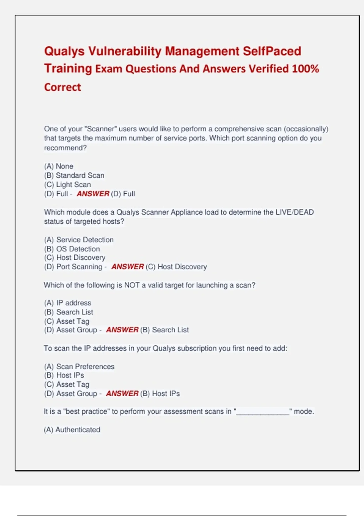 Qualys Vulnerability Management SelfPaced Training Exam Questions And Answers Verified 100% Correct One of your "Scanner" users would like to perform a comprehensive scan (occasionally) that targets the maximum number of service ports. Which port scanning option do you recommend? (A) None (B) Standard Scan (C) Light Scan (D) Full - ANSWER (D) Full Which module does a Qualys Scanner Appliance load to determine the LIVE/DEAD status of targeted hosts? (A) Service Detection (B) OS Detection (C) Host Discovery (D) Port Scanning - ANSWER (C) Host Discovery Which of the following is NOT a valid target for launching a scan? (A) IP address (B) Search List (C) Asset Tag (D) Asset Group - ANSWER (B) Search List To scan the IP addresses in your Qualys subscription you first need to add: (A) Scan Preferences (B) Host IPs (C) Asset Tag (D) Asset Group - ANSWER (B) Host IPs It is a "best practice" to perform your assessment scans in "_____________" mode. (A) Authenticated (B) Authorized (C) Administrative (D) Scanning - ANSWER (A) Authenticated Which of the following are required to launch a vulnerability scan? (Select Three) (A) Target Hosts (B) Scanner Appliance (C) Authentication (D) Option Profile - ANSWER (A) Target Hosts (B) Scanner Appliance (D) Option Profile By default, the agent collects data after every: (A) Four Hours (B) Ten Hours (C) Twelve Hours (D) Six Hours - ANSWER (A) Four Hours Report templates cannot be customized. (A) Incorrect (B) Correct - ANSWER (A) Incorrect Which report type is NOT created from a Report Template? (A) Patch Report (B) Authentication Report (C) Map Report (D) Remediation Report - ANSWER (B) Authentication Report One of your colleagues would like to build a report to display vulnerability findings over the last three months (including trending information)? What do you recommend? (A) Build a scan template that uses Scan Based findings (B) Build a scan template that sorts findings by Asset Group (C) Build a scan template with the "All" Asset Group as its target (D) Build a scan template that uses Host-Based Findings - ANSWER (D) Build a scan template that uses Host-Based Findings Name the types of reports: (Select Four) (A) Scan Report (B) Map Report (C) Patch Report (D) Application Report (E) Remediation Report - ANSWER (A) Scan Report (B) Map Report (C) Patch Report (E) Remediation Report The ________ report allows you to track the status of any vulnerability on any host. (A) Technical (B) Executive (C) Scan (D) Trend - ANSWER (D) Trend Identify the report types that can be scheduled: (Select Three) (A) Asset reports (B) Scan reports using Host-based Findings (C) Patch reports (D) Application reports (E) Remediation reports - ANSWER (B) Scan reports using Host-based Findings (C) Patch reports (E) Remediation reports Identify the most privileged user role. (A) Administrator (B) Manager (C) Scanner (D) Auditor user - ANSWER (B) Manager What are the two components of every Business Unit? (A) Vendors (B) Assets (C) Users (D) Suppliers - ANSWER (B) Assets (C) Users A business unit can have more than one Unit Manager.