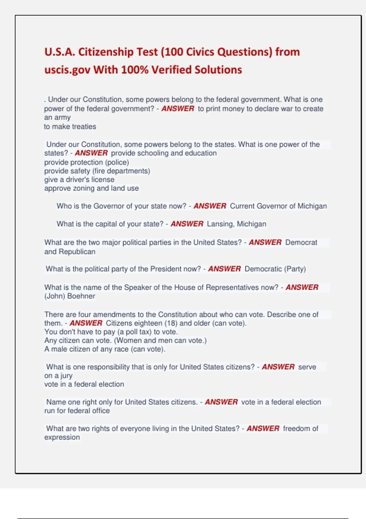 U.S.A. Citizenship Test (100 Civics Questions) from With 100% Verified Solutions . Under our Constitution, some powers belong to the federal government. What is one power of the federal government? - ANSWER to print money to declare war to create an army to make treaties Under our Constitution, some powers belong to the states. What is one power of the states? - ANSWER provide schooling and education provide protection (police) provide safety (fire departments) give a driver's license approve zoning and land use Who is the Governor of your state now? - ANSWER Current Governor of Michigan What is the capital of your state? - ANSWER Lansing, Michigan What are the two major political parties in the United States? - ANSWER Democrat and Republican What is the political party of the President now? - ANSWER Democratic (Party) What is the name of the Speaker of the House of Representatives now? - ANSWER (John) Boehner There are four amendments to the Constitution about who can vote. Describe one of them. - ANSWER Citizens eighteen (18) and older (can vote). You don't have to pay (a poll tax) to vote. Any citizen can vote. (Women and men can vote.) A male citizen of any race (can vote). What is one responsibility that is only for United States citizens? - ANSWER serve on a jury vote in a federal election Name one right only for United States citizens. - ANSWER vote in a federal election run for federal office What are two rights of everyone living in the United States? - ANSWER freedom of expression freedom of speech freedom of assembly freedom to petition the government freedom of worship the right to bear arms 52. What do we show loyalty to when we say the Pledge of Allegiance? - ANSWER the United States the flag 53. What is one promise you make when you become a United States citizen? - ANSWER give up loyalty to other countries defend the Constitution and laws of the United States obey the laws of the United States serve in the U.S. military (if needed) serve (do important work for) the nation (if needed) be loyal to the United States 54. How old do citizens have to be to vote for President? - ANSWER eighteen (18) and older 55. What are two ways that Americans can participate in their democracy? - ANSWER vote join a political party help with a campaign join a civic group join a community group give an elected official your opinion on an issue call Senators and Representatives publicly support or oppose an issue or policy run for office write to a newspaper 56. When is the last day you can send in federal income tax forms? - ANSWER April 15 57. When must all men register for the Selective Service? - ANSWER at age eighteen (18) between eighteen (18) and twenty-six (26) 58. What is one reason colonists came to America? - ANSWER freedom political liberty religious freedom economic opportunity practice their religion escape persecution 59. Who lived in America before the Europeans arrived? - ANSWER American Indians Native Americans 60. What group of people was taken to America and sold as slaves? - ANSWER Africans people from Africa 61. Why did the colonists fight the British? - ANSWER because of high taxes (taxation without representation) because the British army stayed in their houses (boarding, quartering) because they didn't have self-government 62. Who wrote the Declaration of Independence? - ANSWER (Thomas) Jefferson 63. When was the Declaration of Independence adopted? - ANSWER July 4, 1776 65. What happened at the Constitutional Convention? - ANSWER The Constitution was written. The Founding Fathers wrote the Constitution. 66. When was the Constitution written? - ANSWER 1787 67. The Federalist Papers supported the passage of the U.S. Constitution. Name one of the writers. - ANSWER (James) Madison (Alexander) Hamilton (John) Jay Publius 68. What is one thing Benjamin Franklin is famous for? - ANSWER U.S. diplomat oldest member of the Constitutional Convention first Postmaster General of the United States
