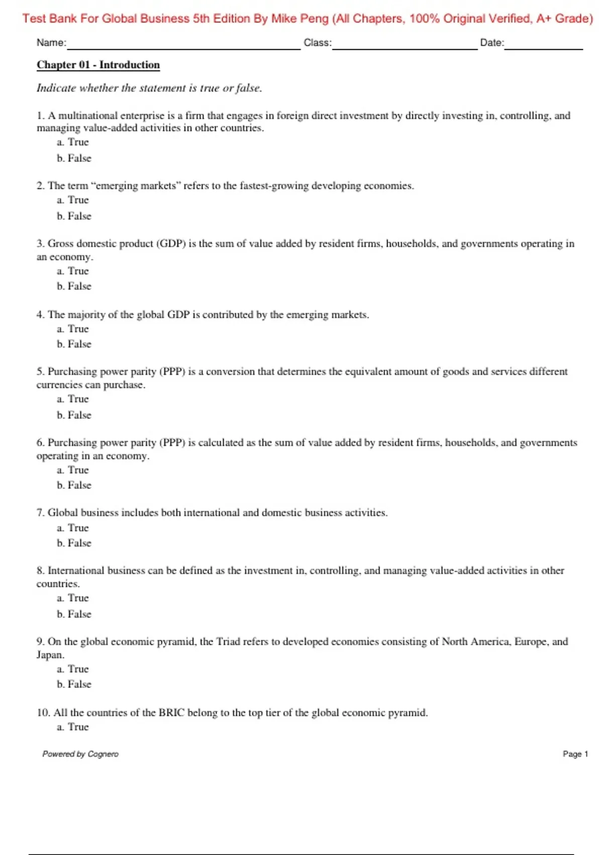Test Bank For Global Business 5th Edition By Mike Peng (All Chapters, 100% Original Verified, A+ Grade)