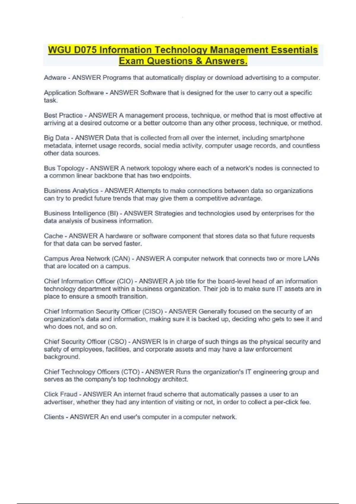 WGU D075 Information Technology Management Essentials Exam Questions & Answers.