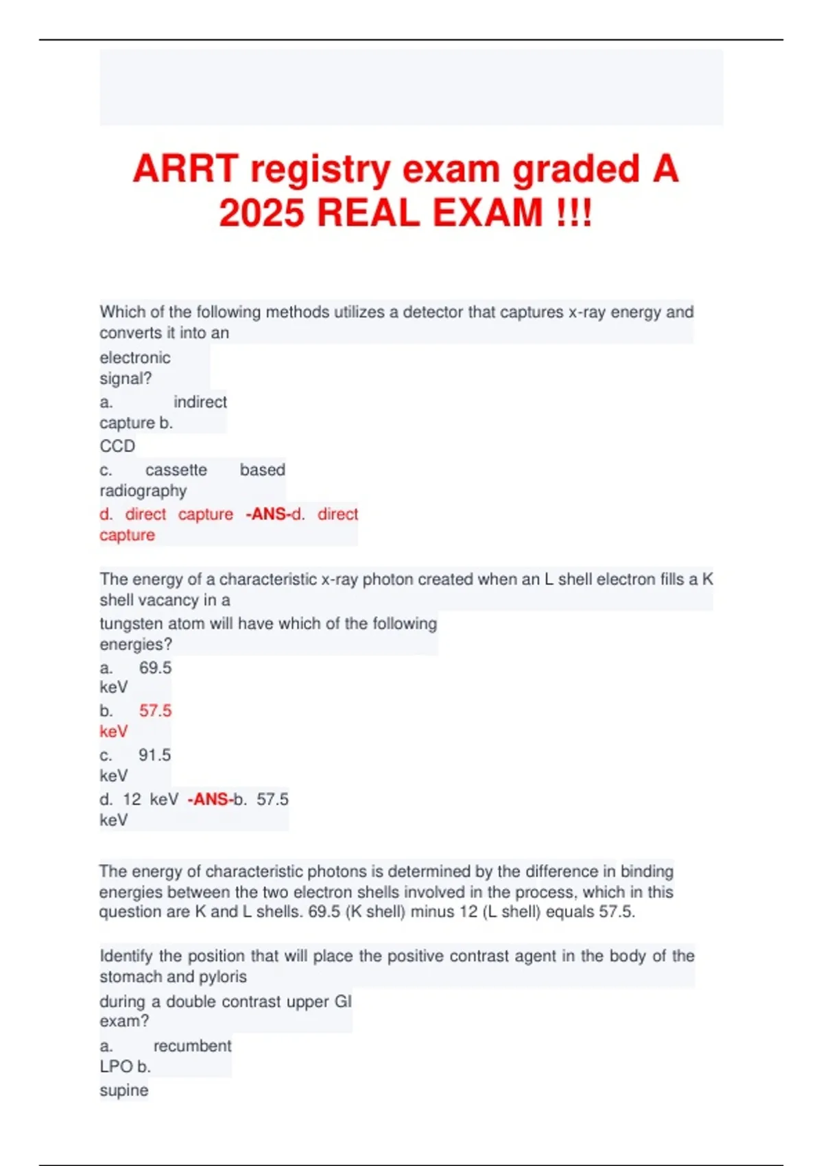 Access the 2025 ARRT Registry Exam with fully verified questions and graded A+ answers. Real exam content designed for radiologic technologist certification and high-yield review.
