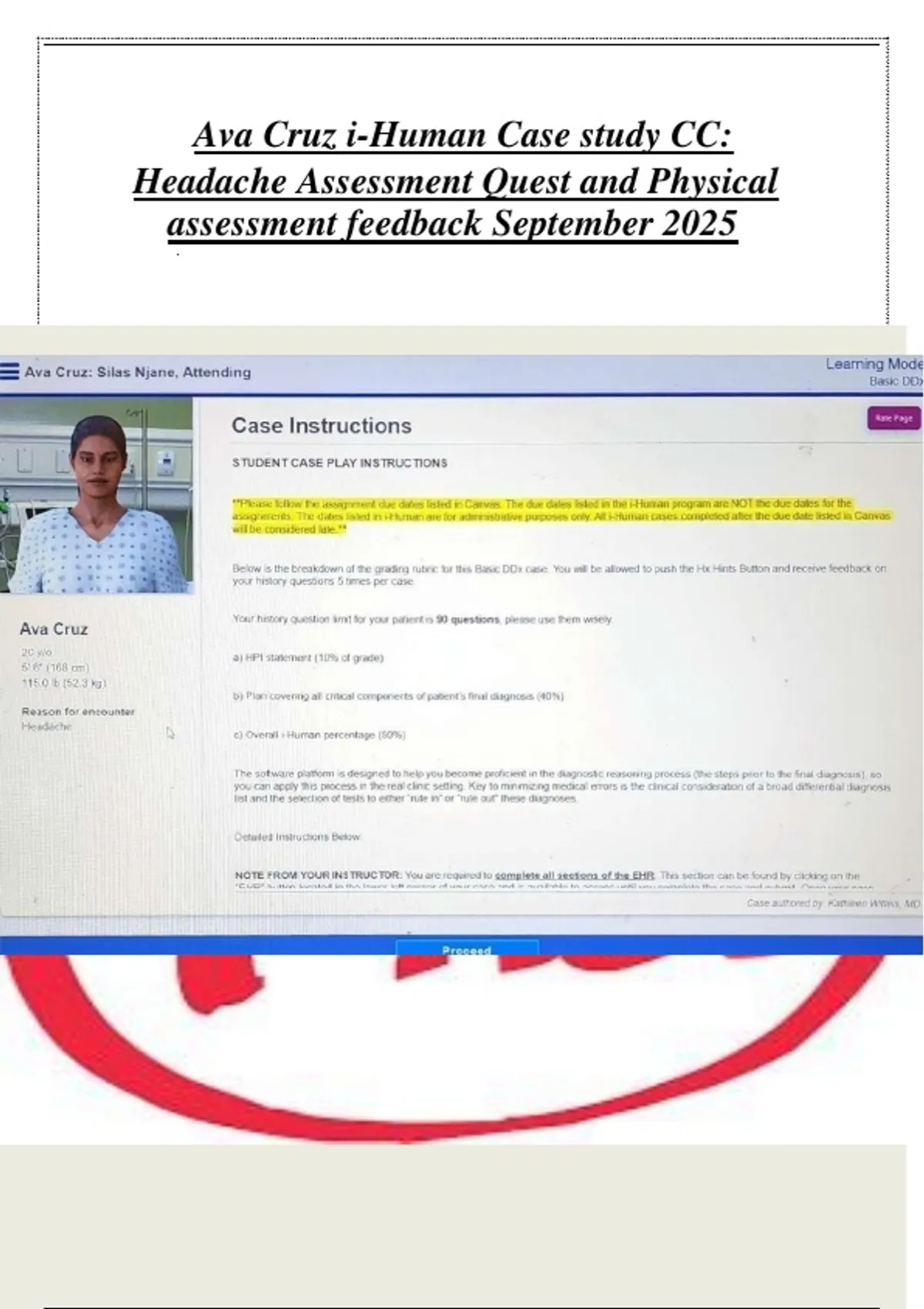 Complete i-Human case study for Ava Cruz focusing on headache assessment. Includes clinical questions, physical exam findings, and detailed feedback for September 2025 nursing and medical education.