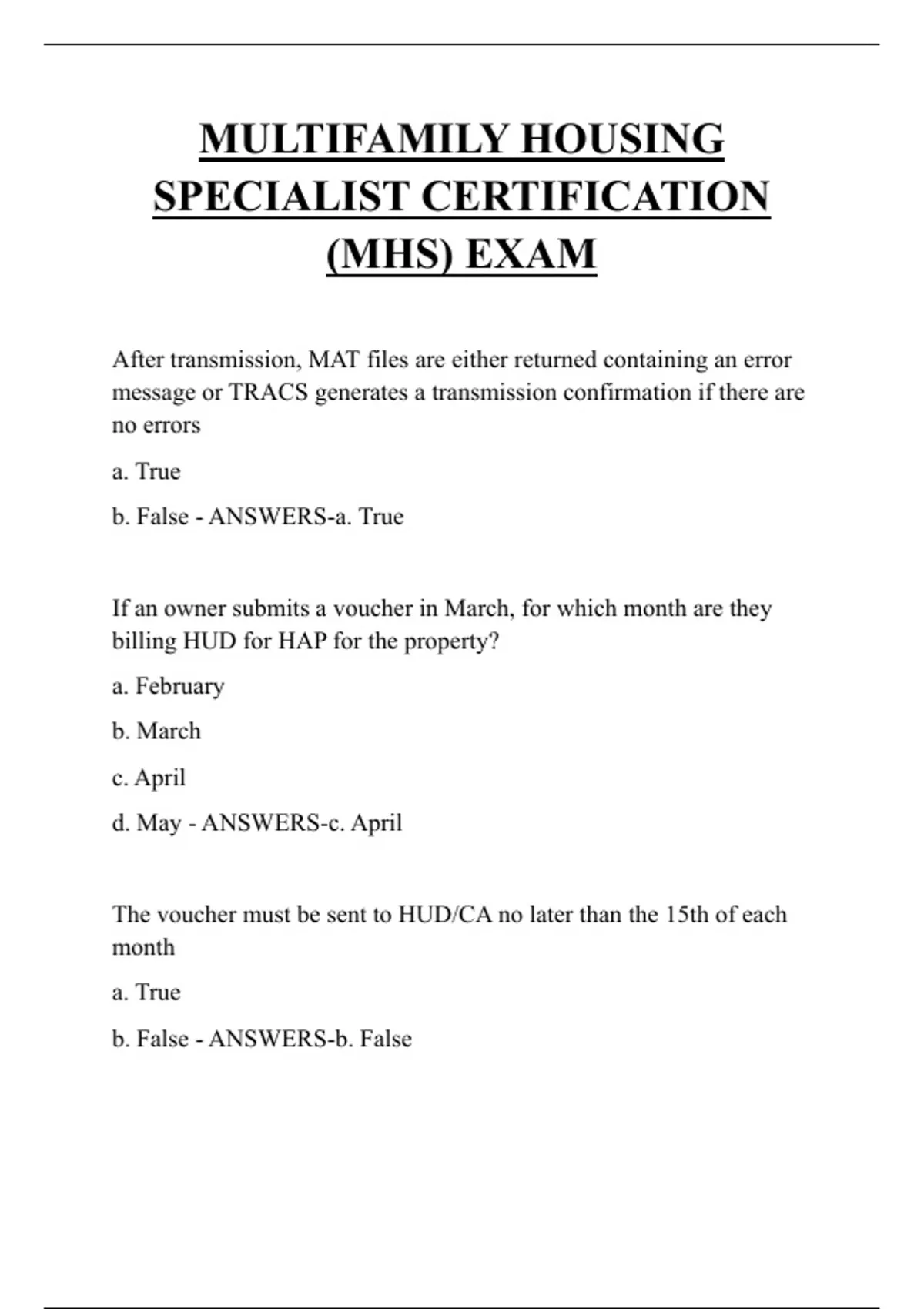 MULTIFAMILY HOUSING SPECIALIST CERTIFICATION (MHS) EXA M QUESTIONS AND ANSWERS 2025