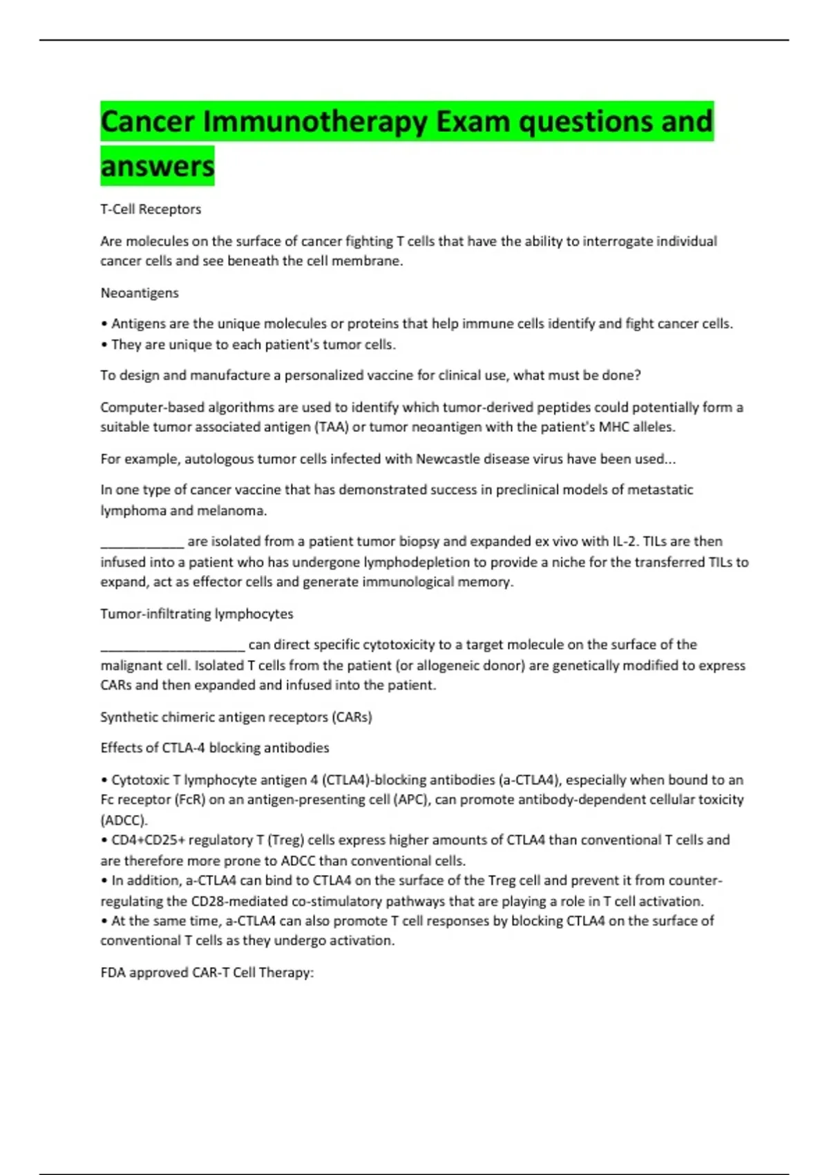 Cancer Immunotherapy Exam questions and answers T-Cell Receptors Are molecules on the surface of cancer fighting T cells that have the ability to interrogate individual cancer cells and see beneath the cell membrane. Neoantigens