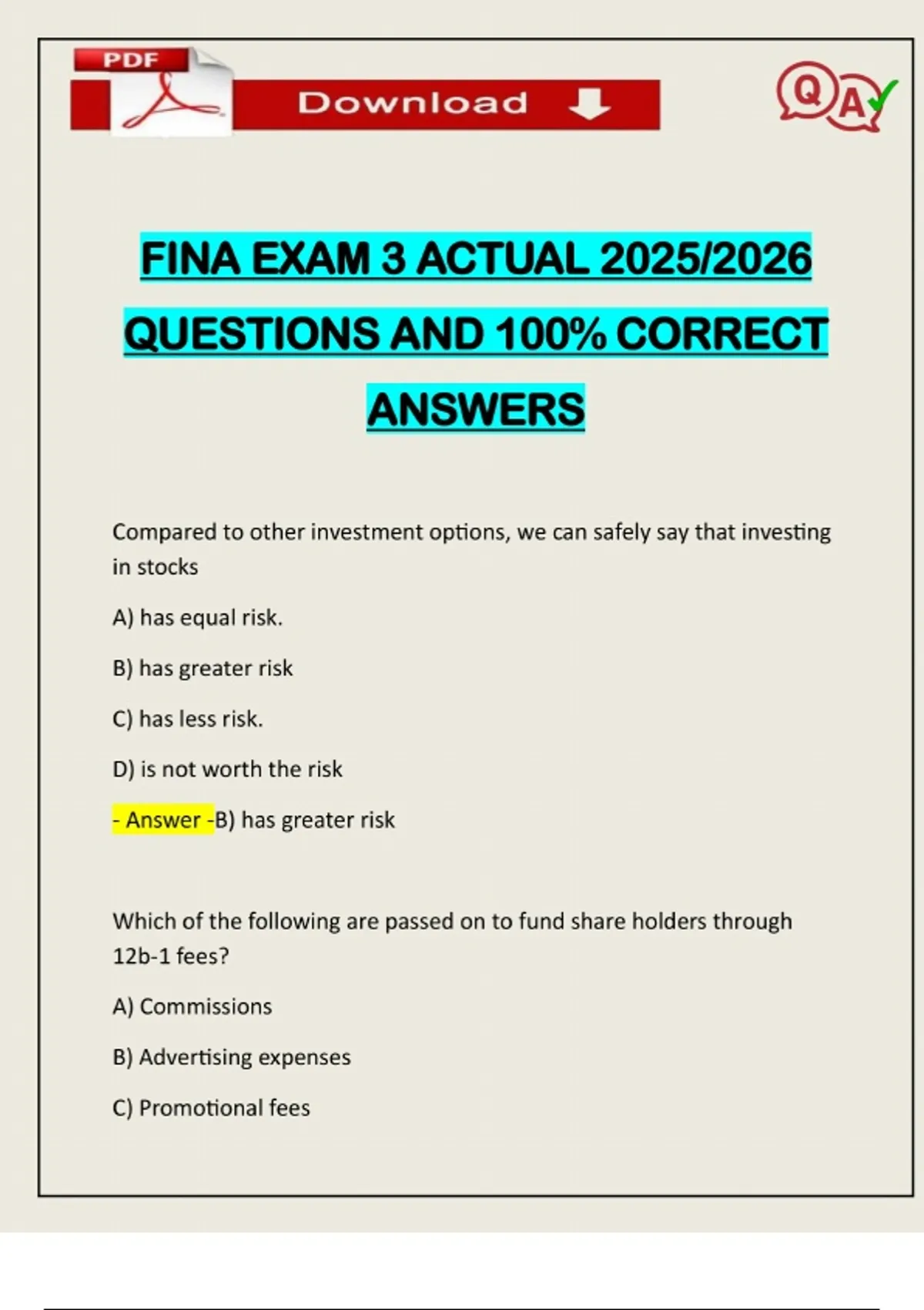 FINA EXAM 3 ACTUAL 2025/2026 QUESTIONS AND 100% CORRECT ANSWERS Compared to other investment options, we can safely say that investing in stocks A) has equal risk. B) has greater risk C) has less risk. D) is not worth the risk - Answer -B) has greater risk Which of the following are passed on to fund share holders through 12b-1 fees? A) Commissions B) Advertising expenses C) Promotional feesNeed assistance on Online classes, Exams & Assignments? Reach out for instant help!! Full Course Assistance, Plagiarism-free Essay Writing, Research Paper, Dissertation, Discussion Posts, etc…. Confidential & Secure services. Tutors are available for all subjects! Email now at: D) Only B and C E) All of the above - Answer -D) Only B and C Which of the following will affect your capital gains liability? A) Turnover ratio B) Chang