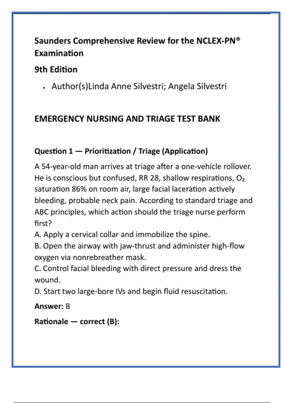 EMERGENCY NURSING AND TRIAGE TEST BANK