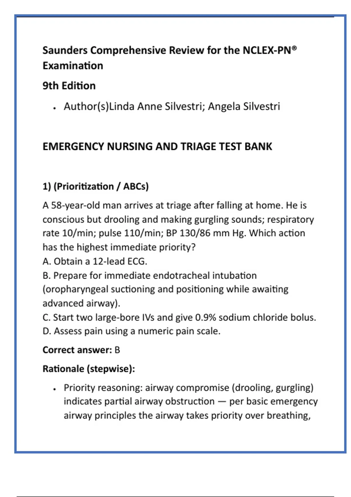 EMERGENCY NURSING AND TRIAGE TEST BANK
