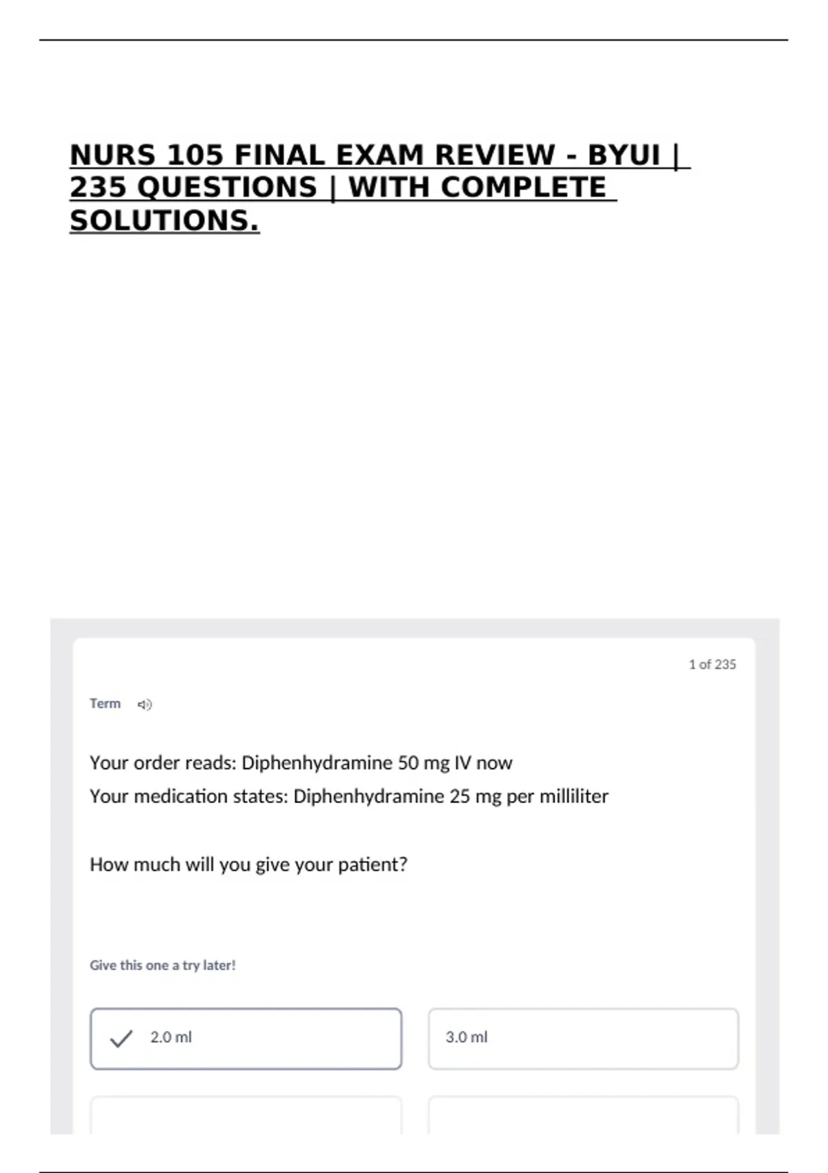 NURS 105 FINAL EXAM REVIEW - BYUI | 235 QUESTIONS | WITH COMPLETE SOLUTIONS.
