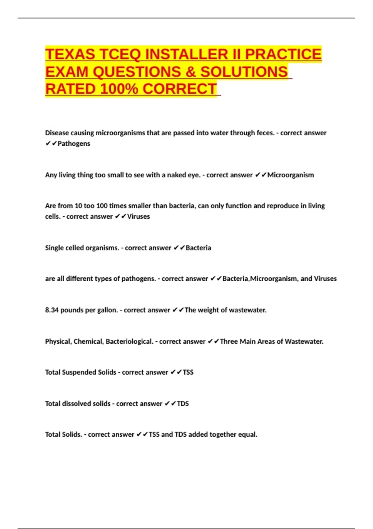 TEXAS TCEQ INSTALLER II PRACTICE EXAM QUESTIONS & SOLUTIONS RATED 100% CORRECT is a digital study set created to help learners prepare for the Texas Commission on Environmental Quality (TCEQ) licensing exams.