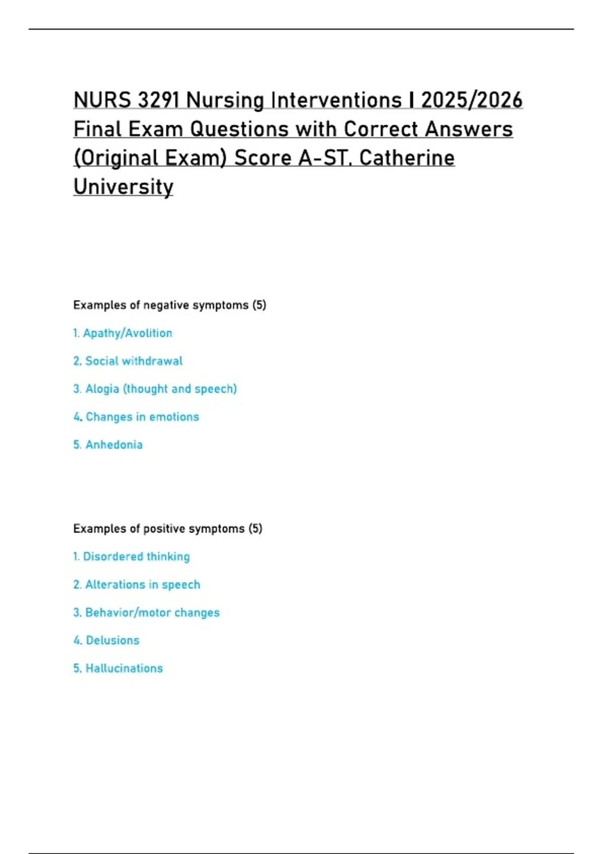 NURS 3291 Nursing Interventions I 2025/2026 Final Exam Questions with Correct Answers (Original Exam) Score A-ST. Catherine University Examples of negative symptoms (5) 1. Apathy/Avolition 2. Social withdrawal 3. Alogia (thought and speech) 4. Changes in emotions 5. Anhedonia Examples of positive symptoms (5) 1. Disordered thinking 2. Alterations in speech 3. Behavior/motor changes 4. Delusions 5. Hallucinations