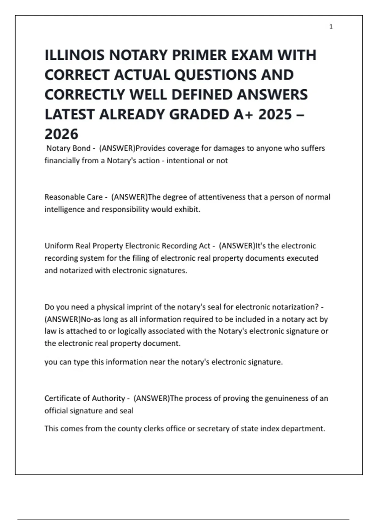 ILLINOIS NOTARY PRIMER EXAM WITH CORRECT ACTUAL QUESTIONS AND CORRECTLY WELL DEFINED ANSWERS LATEST ALREADY GRADED A+ 2025 – 2026