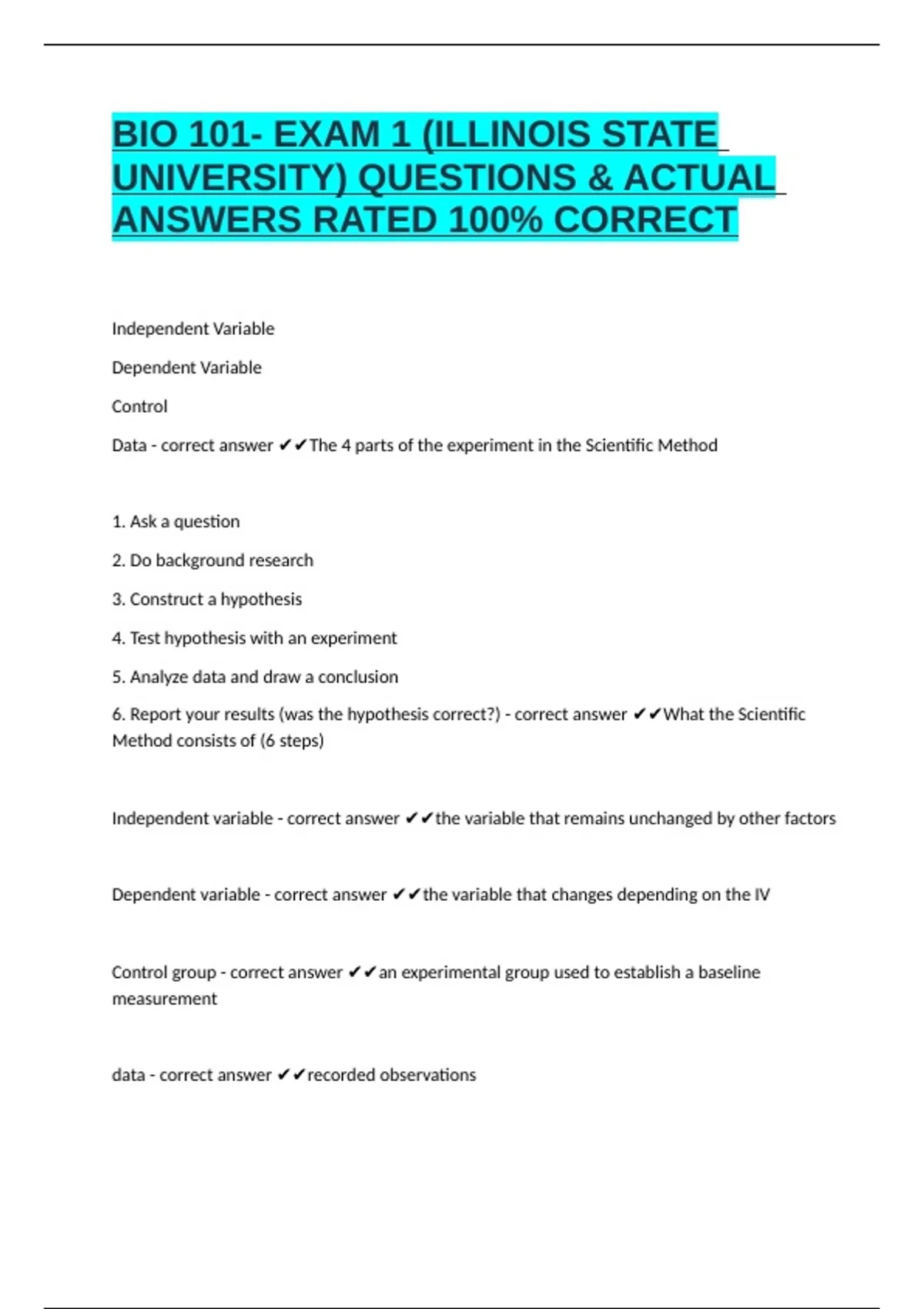 BIO 101- EXAM 1 (ILLINOIS STATE UNIVERSITY) QUESTIONS & ACTUAL ANSWERS RATED 100% CORRECT often made by students or instructors and include flashcards, practice questions, and matching games focused on the main topics of the exam.
