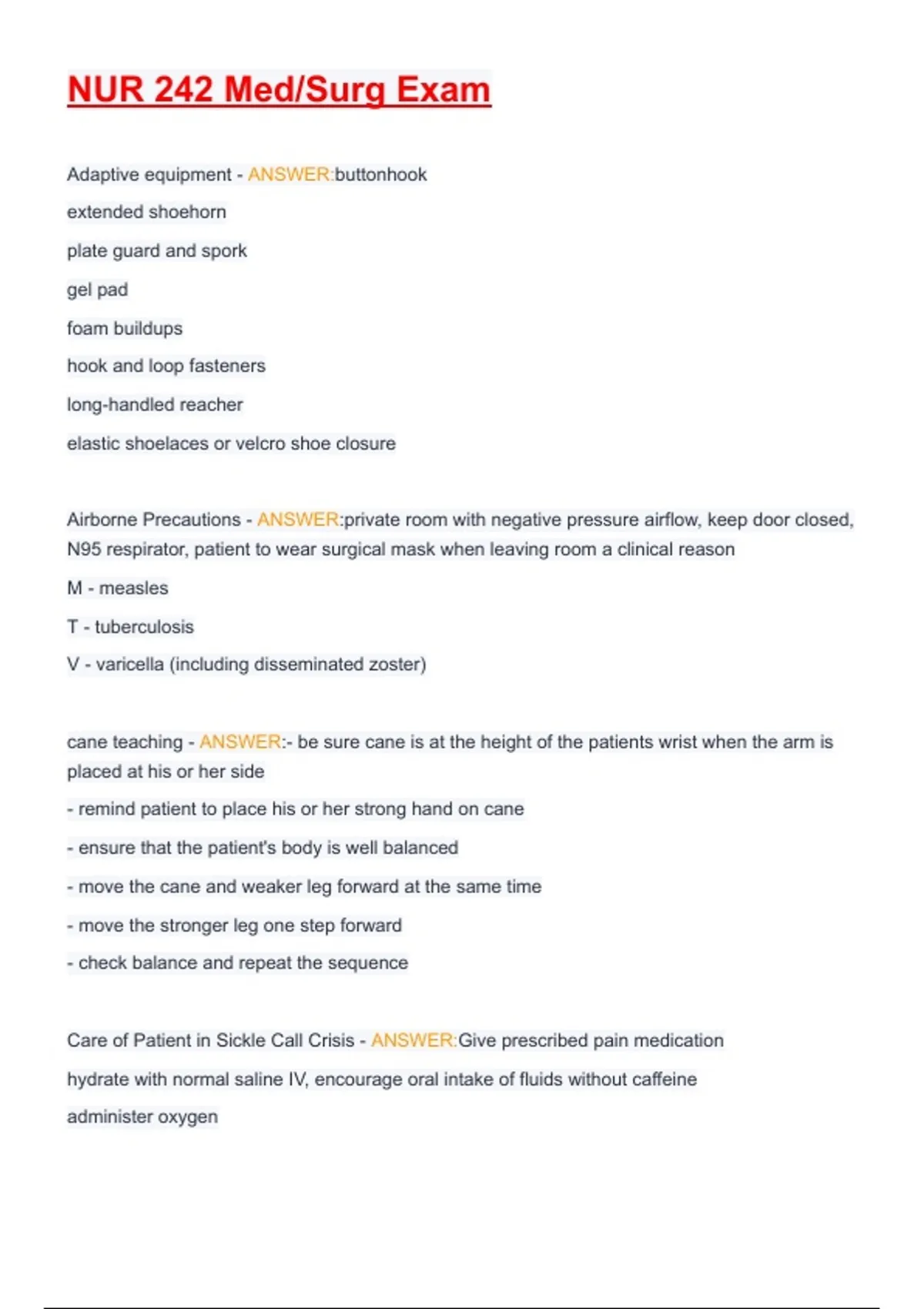 NUR 242 Med/Surg Exam 1Questions and Verified Answers | Grade A | 100%