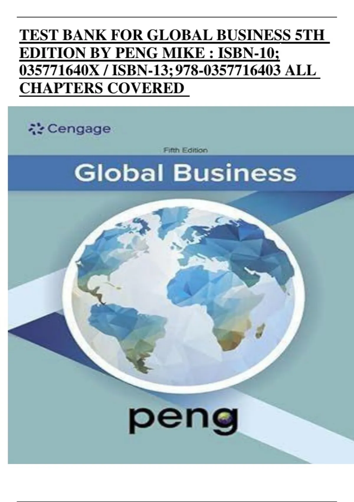 This document provides the complete test bank for Global Business, 5th Edition by Mike W. Peng. It includes detailed multiple-choice, true/false, and application-based questions with correct answers for all chapters. Topics span international trade, global strategy, emerging markets, cultural and institutional frameworks, and international management practices. This resource is ideal for students and instructors preparing for exams or reviewing core concepts in global business and international management.