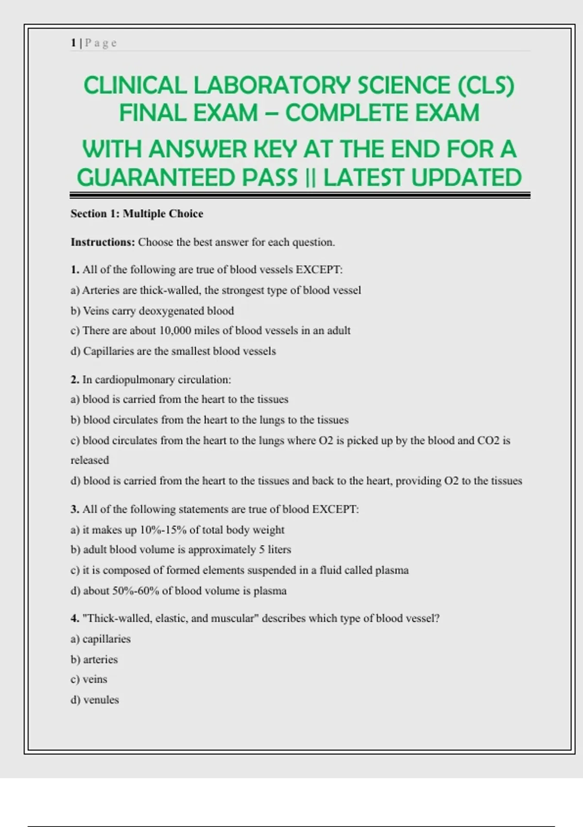CLINICAL LABORATORY SCIENCE (CLS) FINAL EXAM – COMPLETE EXAM WITH ANSWER KEY AT THE END FOR A GUARANTEED PASS || LATEST UPDATED