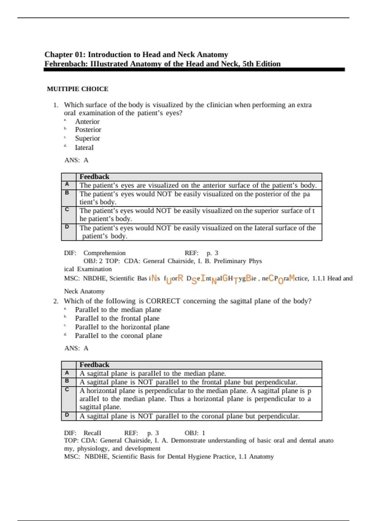 This document provides the complete test bank for Illustrated Dental Embryology, Histology, and Anatomy (5th edition by Fehrenbach), covering all 20 chapters of the textbook. It includes multiple-choice, multiple-response, matching, and application-based questions, each accompanied by the correct answer and, in many cases, explanatory feedback. The questions are designed to test comprehension, recall, and applied understanding, making it an essential resource for exam preparation. The content spans the full range of dental anatomy and histology topics: head and neck anatomy, oral cavity and pharynx, prenatal and orofacial development, tooth development and eruption, oral tissues, enamel, dentin, pulp, periodontium, temporomandibular joint, occlusion, and both primary and permanent dentitions. Because of its detailed structure and alignment with CDA and NBDHE competencies, this test bank is especially valuable for dental students, dental hygiene students, and anyone preparing for licensing or certification exams. By working through these test questions, students can self-assess their knowledge, practice exam-style questions, and identify weak areas before formal assessments. This makes the document not only a study aid but also a comprehensive tool for mastering key concepts in dental embryology, histology, and anatomy.