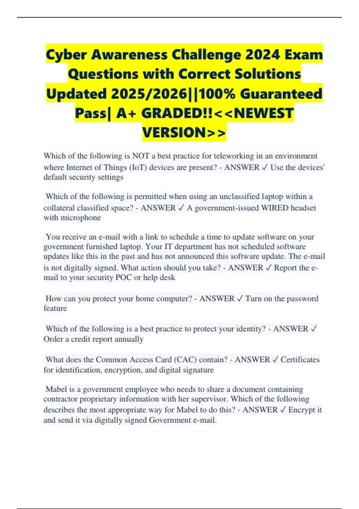 Cyber Awareness Challenge 2024 Exam Questions with Correct Solutions Updated 2025/2026||100% Guaranteed Pass| A+ GRADED!!&lt;&lt;NEWEST VERSION&gt;&gt; Which of the following is NOT a best practice for teleworking in an environment where Internet of Things (IoT) devices are present? - ANSWER Use the devices' default security settings Which of the following is permitted when using an unclassified laptop within a collateral classified space? - ANSWER A government-issued WIRED headset with microphone You receive an e-mail with a link to schedule a time to update software on your government furnished laptop. Your IT department has not scheduled software updates like this in the past and has not announced this software update. The e-mail is not digitally signed. What action should you take? - ANSWER Report the email to your security POC or help desk How can you protect your home computer? - ANSWER Turn on the password feature Which of the following is a best practice to protect your identity? - ANSWER Order a credit report annually What does the Common Access Card (CAC) contain? - ANSWER Certificates for identification, encryption, and digital signature Mabel is a government employee who needs to share a document containing contractor proprietary information with her supervisor. Which of the following describes the most appropriate way for Mabel to do this? - ANSWER Encrypt it and send it via digitally signed Government e-mail. Which of the following is NOT an appropriate use of your Common Access Card (CAC)? - ANSWER Using it as photo identification with a commercial entity Tom is working on a report that contains employees' names, home addresses, and salary. Which of the following is Tom prohibited from doing with the report? - ANSWER Using his home computer to print the report while teleworking What conditions are necessary to be granted access to Sensitive Compartmented Information (SCI)? - ANSWER Top Secret clearance and indoctrination into the SCI program After reading an online story about a new security project being developed on the military installation where you work, your neighbor asks you to comment about the article. You know that this project is classified. How should you respond? - ANSWER Attempt to change the subject to something non-work related, but neither confirm nor deny the article's authenticity Which of the following may help to prevent spillage? - ANSWER Label all files, removable media, and subject headers with appropriate classification markings. A user writes down details marked as Secret from a report stored on a classified system and uses those details to draft a briefing on an unclassified system without authorization. What is the best choice to describe what has occurred? - ANSWER Spillage because classified data was moved to a lower classification level system without authorization. What should you do when you are working on an unclassified system and receive an email with a classified attachment? - ANSWER Call your security point of contact immediately What should you do if a reporter asks you about potentially classified information on the web? - ANSWER Ask for information about the website, including the URL. What should you do if a reporter asks you about potentially classified information on the web? - ANSWER Refer the reporter to your organization's public affairs office.