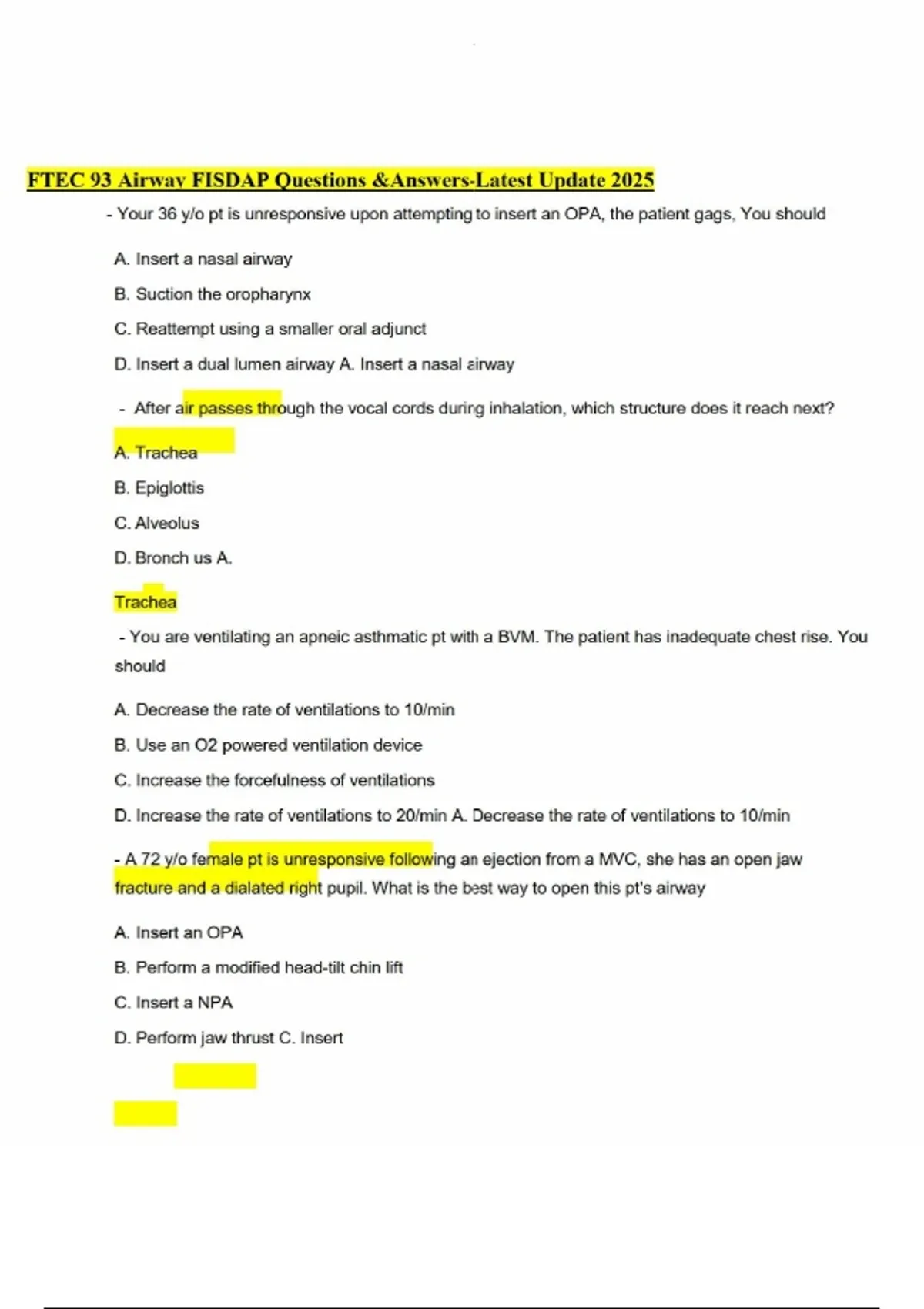 ftec 93 airway fisdap questions answers latest up