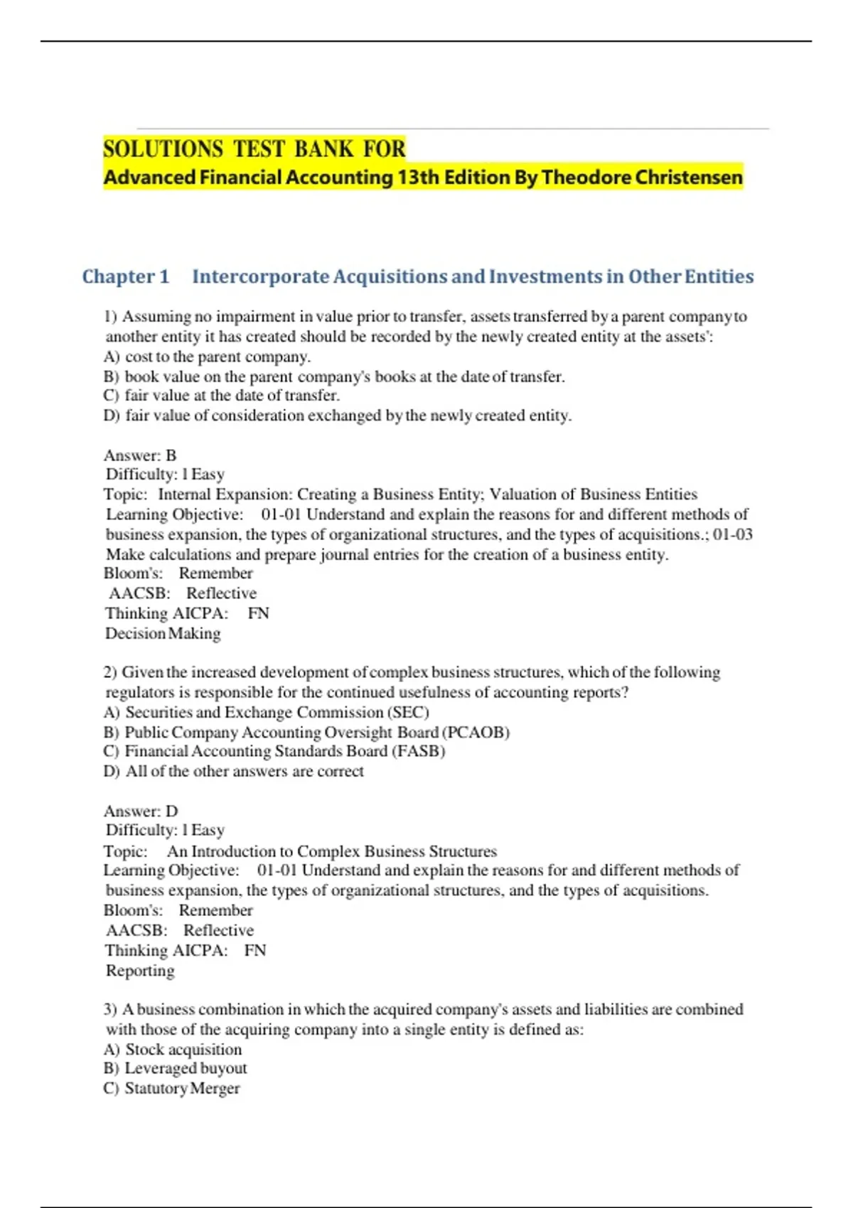 TEST BANK For Advanced Financial Accounting 13th Edition By Theodore Christensen Chapter 1 - 20 |Complete Newest Version