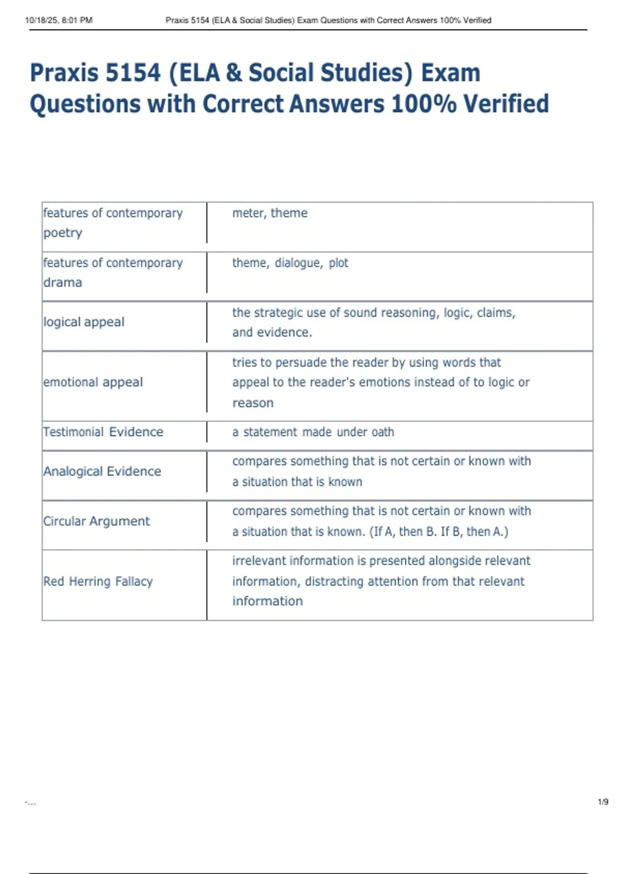 , 10/18/25, 8:01 PM Praxis 5154 (ELA & Social Studies) Exam Questions with Correct Answers 100% Verified