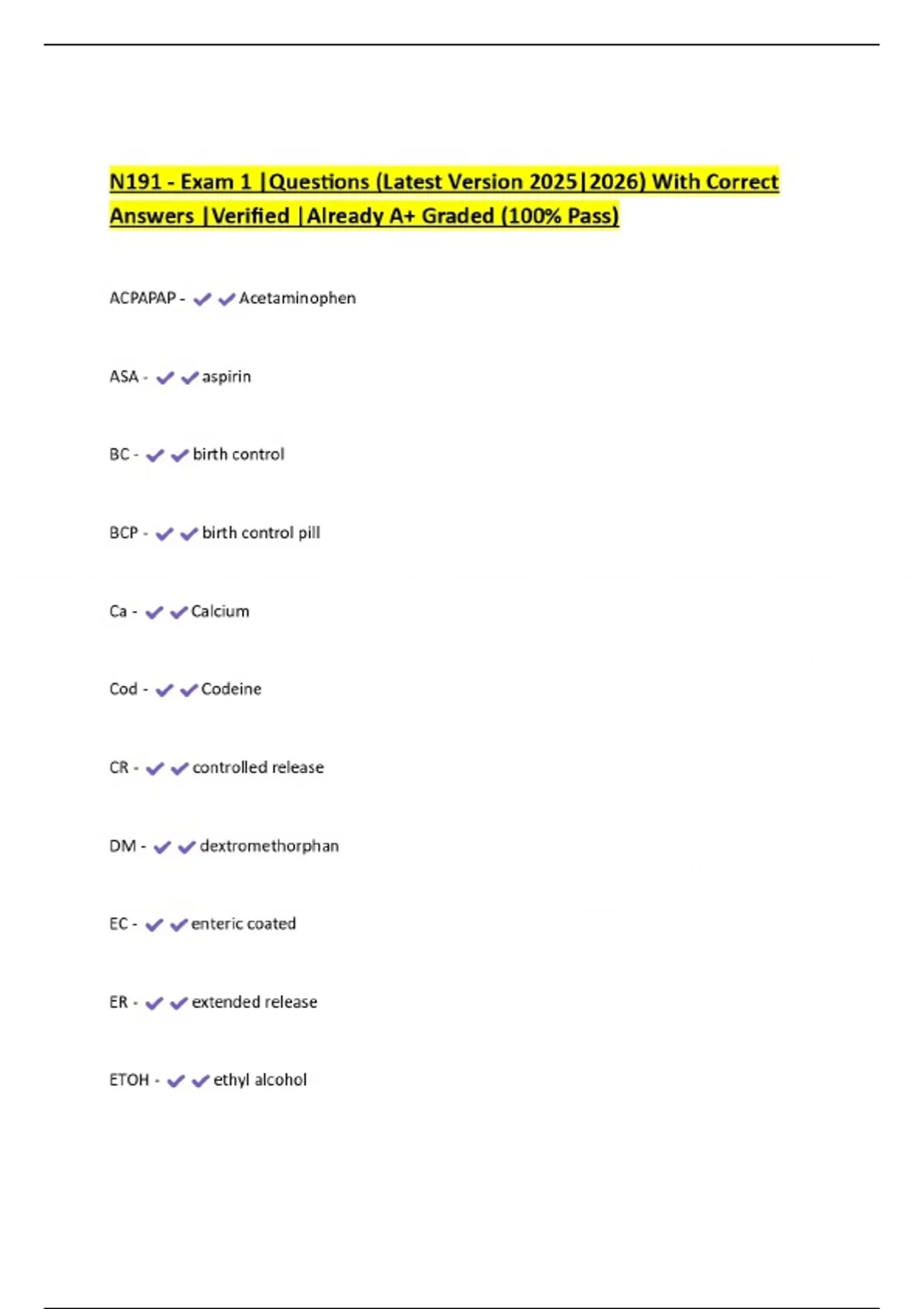 N191 - Exam 1 |Questions (Latest Version 2025|2026) With Correct Answers |Verified |Already A+ Graded (100% Pass)