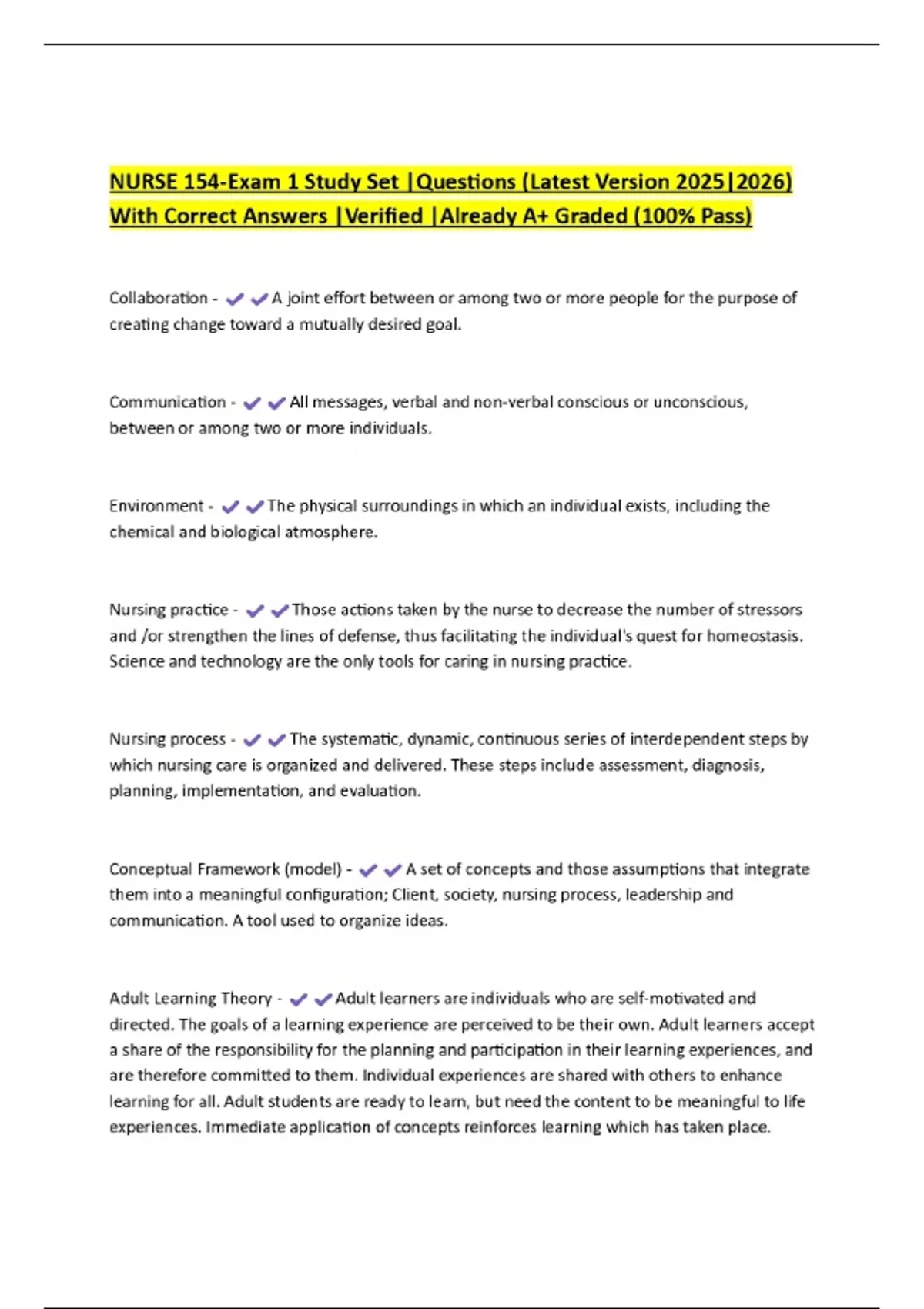 NURSE 154-Exam 1 Study Set |Questions (Latest Version 2025|2026) With Correct Answers |Verified |Already A+ Graded (100% Pass)