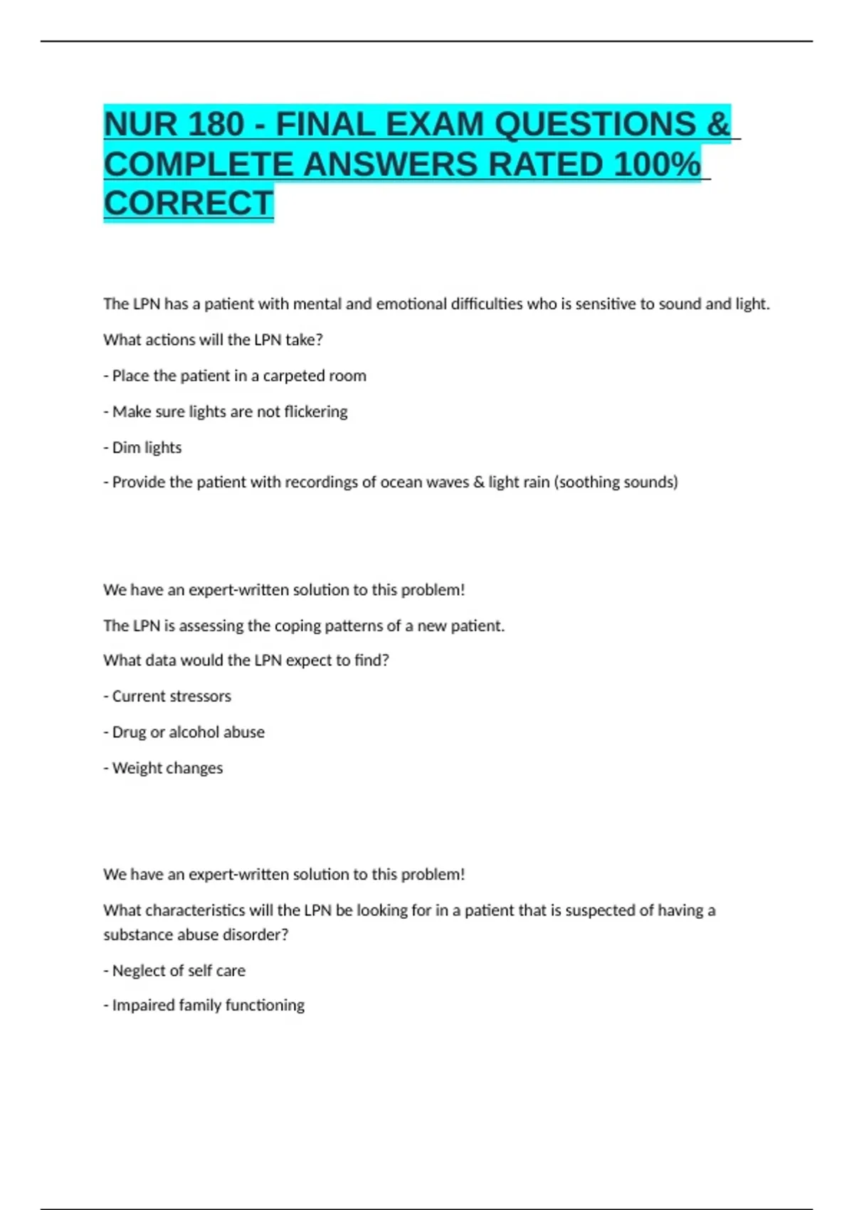 NUR 180 - FINAL EXAM QUESTIONS & COMPLETE ANSWERS RATED 100% CORRECT