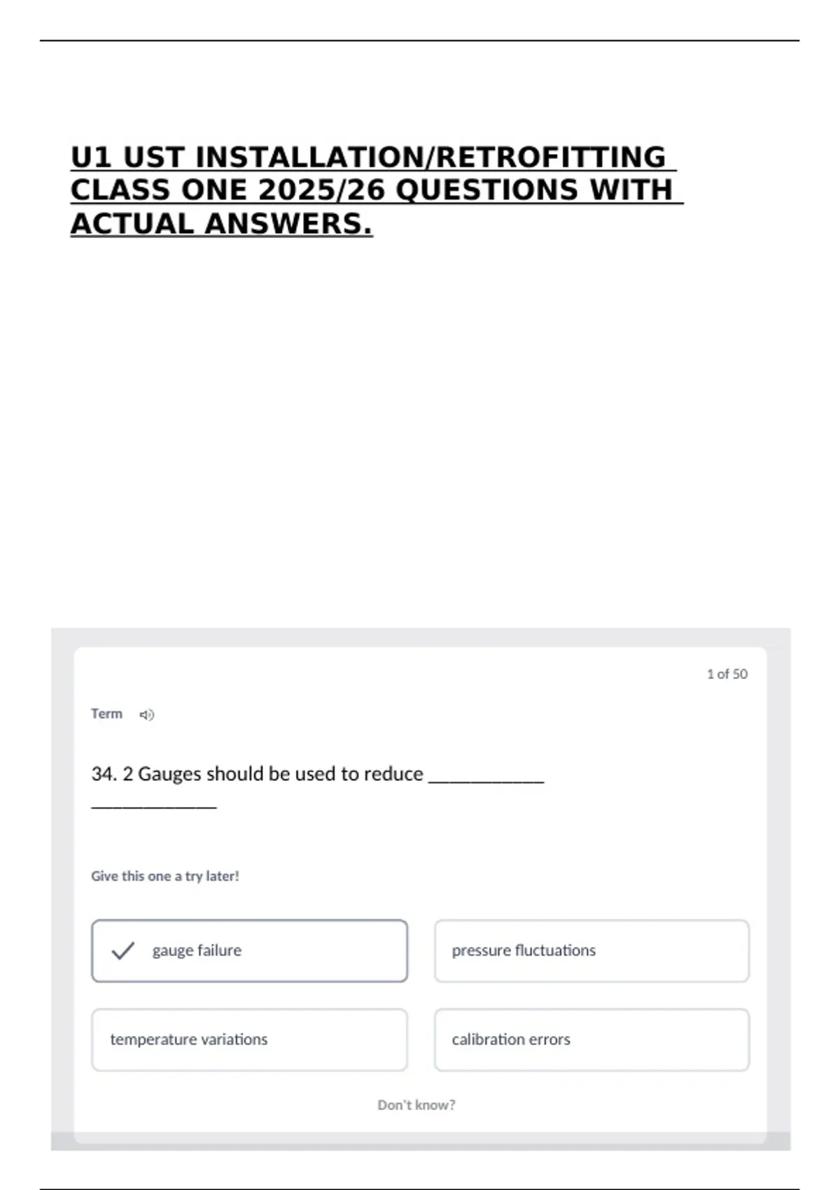 U1 UST INSTALLATION/RETROFITTING CLASS ONE 2025/26 QUESTIONS WITH ACTUAL ANSWERS.