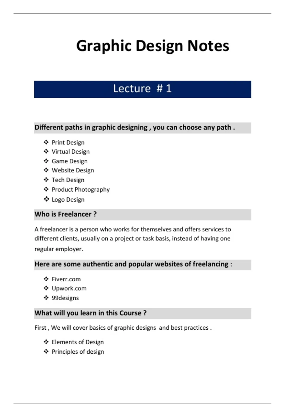 First , We will cover basics of graphic designs and best practices .