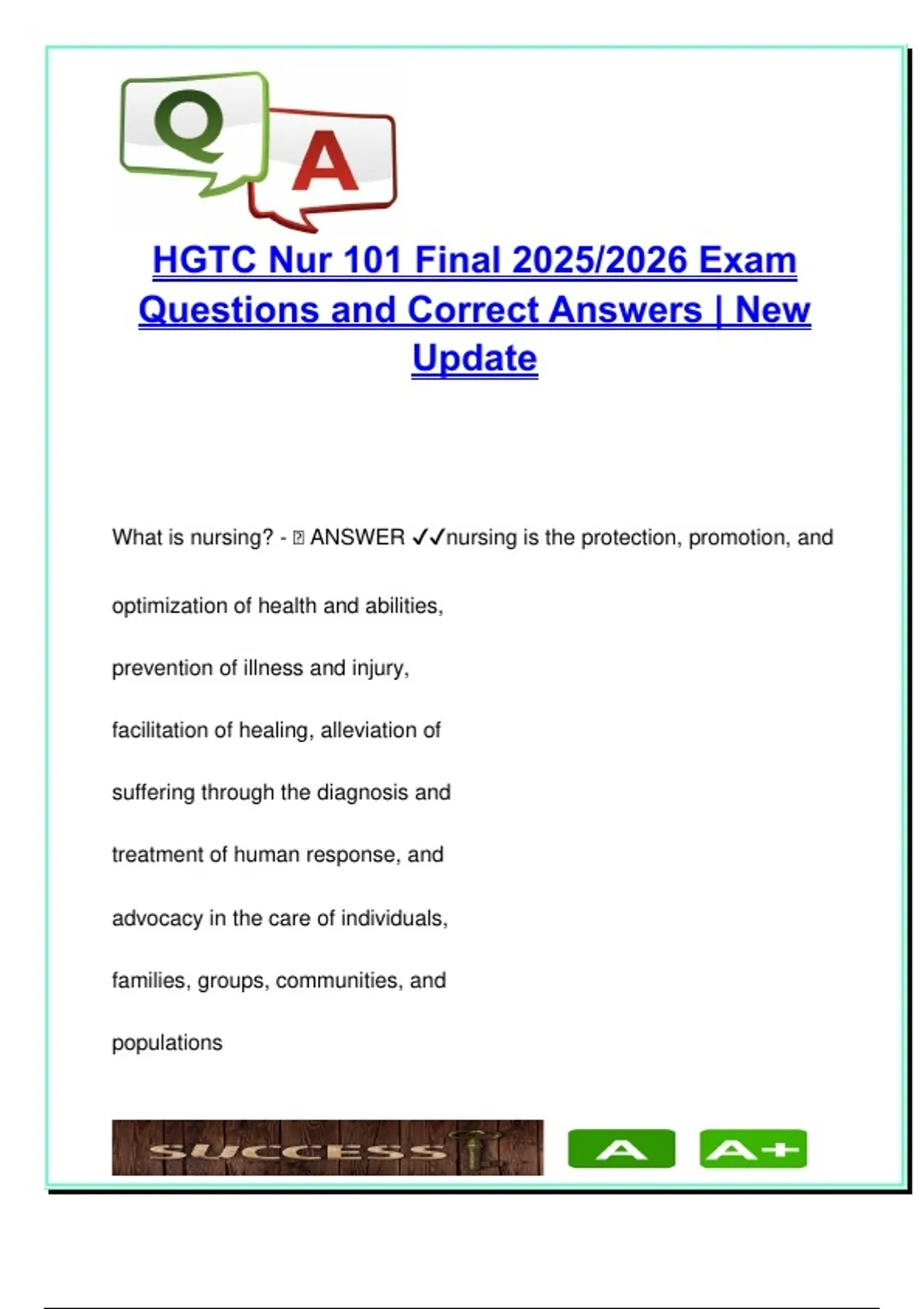 This document contains 100+ fully verified and accurate questions and answers designed for the NUR 101 Final Exam at Horry-Georgetown Technical College (HGTC) for the 2025/2026 academic year. Covering the fundamentals of nursing, this resource is structured to support both classroom learning and exam preparation by reinforcing clinical reasoning, safety practices, and core patient care principles. It includes detailed questions from real-world nursing scenarios with correct answers clearly marked, reflecting the latest best practices and NCLEX-style formats. This study guide is ideal for first-semester nursing students or anyone enrolled in an introductory practical or associate degree nursing program. Key Topics Covered: – Safety protocols (fall risk, restraints, emergency preparedness) – Infection control (PPE, isolation, hand hygiene, standard precautions) – Nursing process: assessment, diagnosis, planning, implementation, evaluation – Documentation standards and legal/ethical practice – Patient communication, therapeutic interaction, and cultural sensitivity – Vital signs, mobility, hygiene, comfort, and pain management – Nutrition, elimination, and skin integrity (including pressure injury prevention) – Delegation, prioritization, and teamwork in clinical settings – Medication administration basics and dosage understanding – Concepts of health promotion, wellness, and illness prevention Ideal for: – HGTC NUR 101 students preparing for final exams – ADN, PN, or LPN students in their first semester of nursing school – Nursing fundamentals instructors needing ready-made review content – NCLEX-PN or NCLEX-RN candidates reinforcing foundational content – Students in South Carolina nursing programs following similar curricula Whether you're reviewing key concepts, preparing for skills check-offs, or studying for final exams, this guide offers comprehensive and accessible support for success in NUR 101. Keywords: NUR 101 final, HGTC nursing, fundamentals of nursing, infection control, patient safety, nursing process, documentation, vital signs, comfort and hygiene, NCLEX prep, nursing school exam, communication in nursing, health promotion, first semester nursing, restraints and PPE