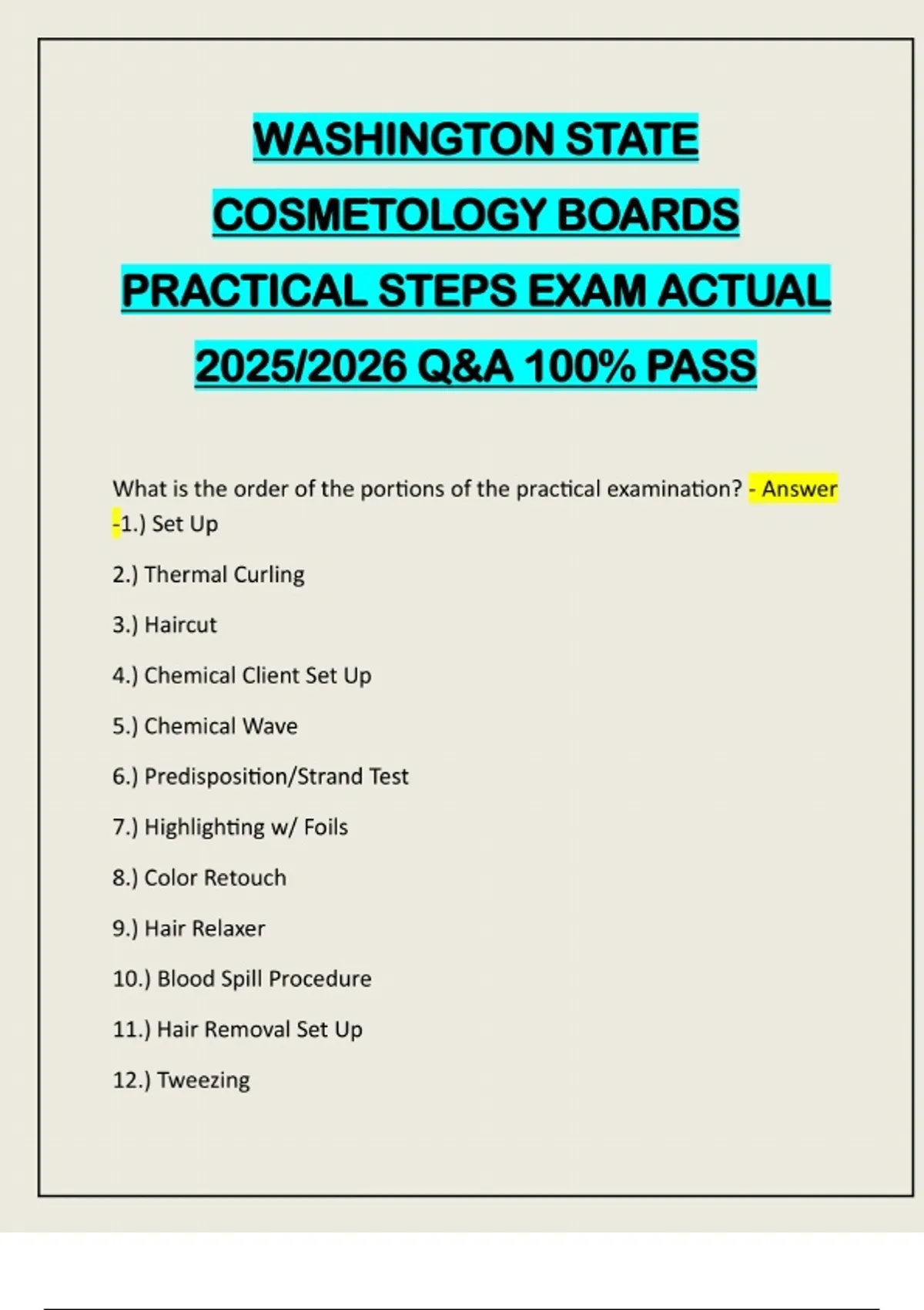 WASHINGTON STATE COSMETOLOGY BOARDS PRACTICAL STEPS EXAM ACTUAL 2025/2026 Q&A 100% PASS What is the order of the portions of the practical examination? - Answer -1.) Set Up 2.) Thermal Curling 3.) Haircut 4.) Chemical Client Set Up 5.) Chemical Wave 6.) Predisposition/Strand Test 7.) Highlighting w/ Foils 8.) Color Retouch 9.) Hair Relaxer 10.) Blood Spill Procedure 11.) Hair Removal Set Up 12.) Tweezing13.) Waxing 14.) Manicure Set Up 15.) Manicure List the steps for setting up for your first portion of the Washington state boards practical examination. - Answer -1.) Access kit & remove bags for trash, items to be disinfected, & soiled linens. Also remove paper towels/quatz bag and set up bag 2.) Set up bags for trash, items to be disinfected, & soiled linens 3.) Sanitize work area 4.) Set up items in set up bag 5.) Sanitize hands & access kit for mannequin head, close, & set it up 6.) Sanitize hands, access kit for thermal/haircutting bag, & set out contents of bag 7.) Single drake client for thermal & haircut 8.) Sanitize hands & step back List the steps for thermal curling portion of the practical examination. - Answer -1.) Sanitize hands 2.) Brush out hair 3.) Test curling iron on light paper 4.) Form smooth/even curls *2 on top on-base