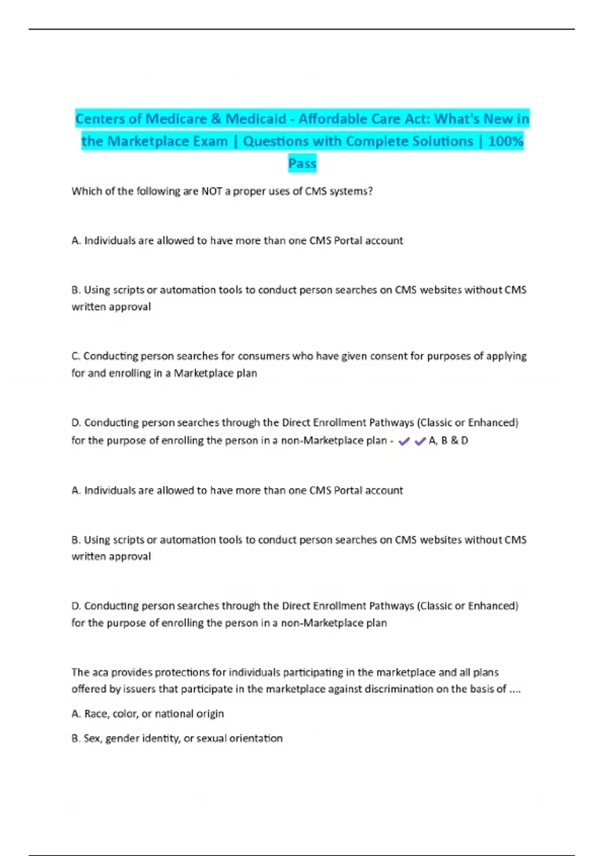 Centers of Medicare & Medicaid - Affordable Care Act: What's New in the Marketplace Exam | Questions with Complete Solutions | 100% Pass