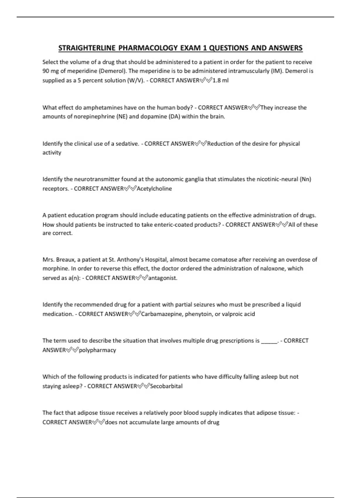 STRAIGHTERLINE PHARMACOLOGY EXAM 1 QUESTIONS AND ANSWERS Select the volume of a drug that should be administered to a patient in order for the patient to receive 90 mg of meperidine (Demerol). The meperidine is to be administered intramuscularly (IM). Demerol is supplied as a 5 percent solution (W/V). - CORRECT ANSWER1.8 ml