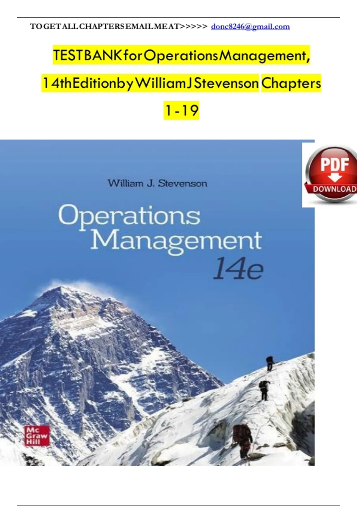 TEST BANK for Operations Management, 14th Editionby William J Stevenson Chapters 1 - 19INSTANT PDF DOWNLOAD — Get the Test Bank for Operations Management (14th Edition) by William J. Stevenson, covering Chapters 1 through 19. This extensive resource includes multiple-choice, true/false, and short answer questions mapped to the textbook’s chapter layout. It reinforces topics like operations strategy, forecasting, process design, capacity planning, quality management, inventory control, supply chain, scheduling, project management, waiting line theory, and linear programming. Whether used by students for exam prep or instructors for quiz creation, this test bank aligns directly with the Stevenson text to provide targeted practice and improve mastery of operations concepts.