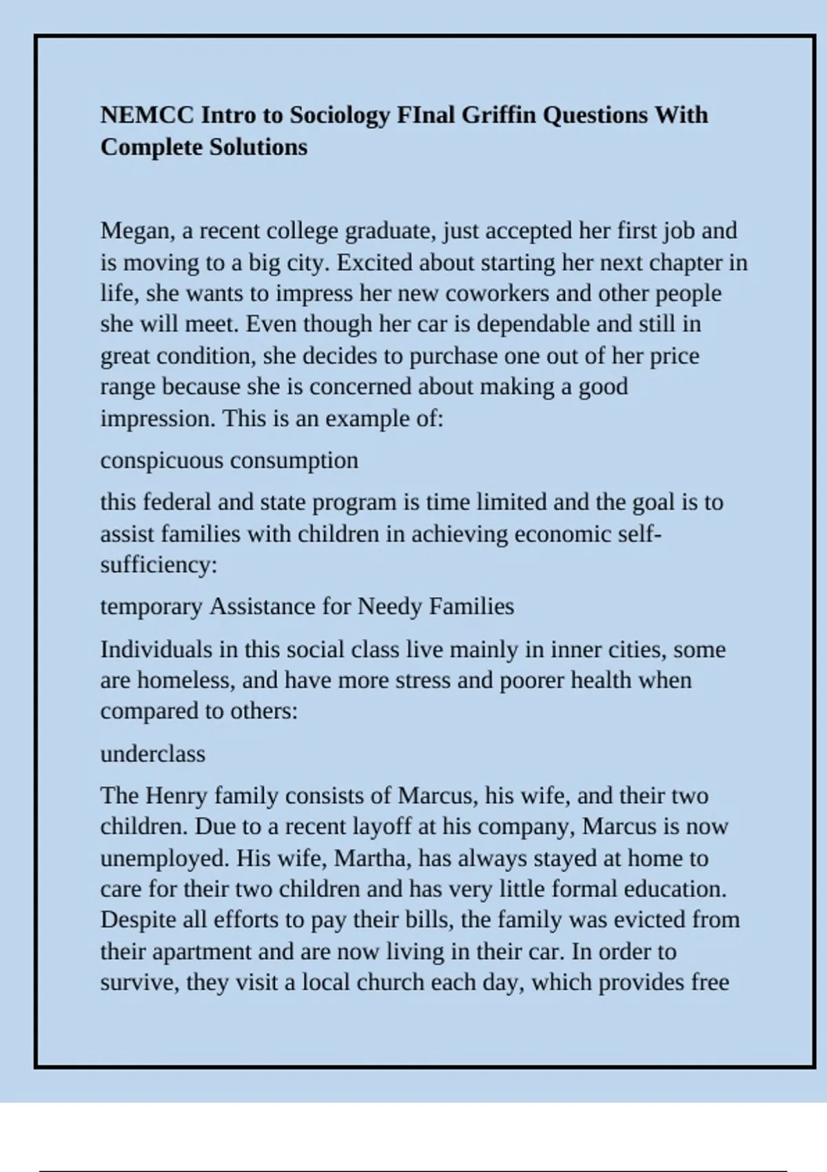 NEMCC Intro to Sociology FInal Griffin Questions With Complete Solutions