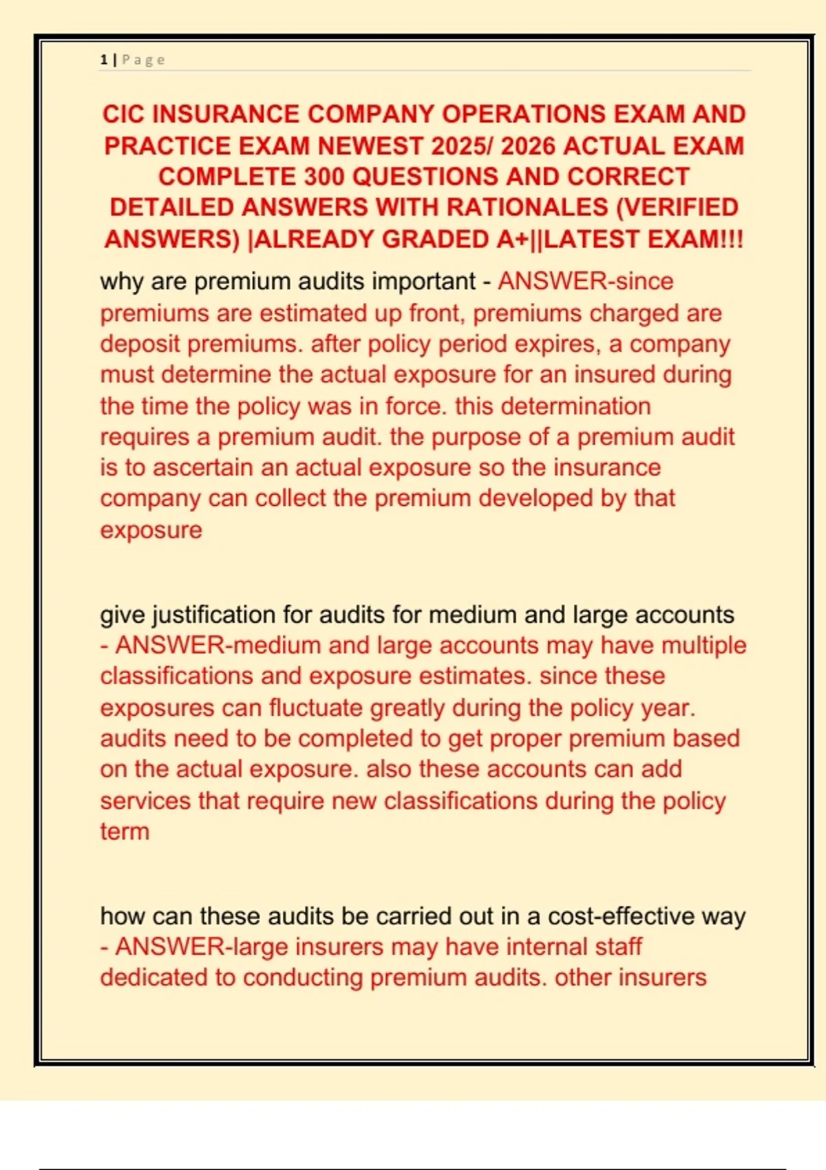 CIC INSURANCE COMPANY OPERATIONS EXAM AND PRACTICE EXAM NEWEST 2025/ 2026 ACTUAL EXAM COMPLETE 300 QUESTIONS AND CORRECT DETAILED ANSWERS (VERIFIED ANSWERS) |ALREADY GRADED A+||NEWEST EXAM!!!