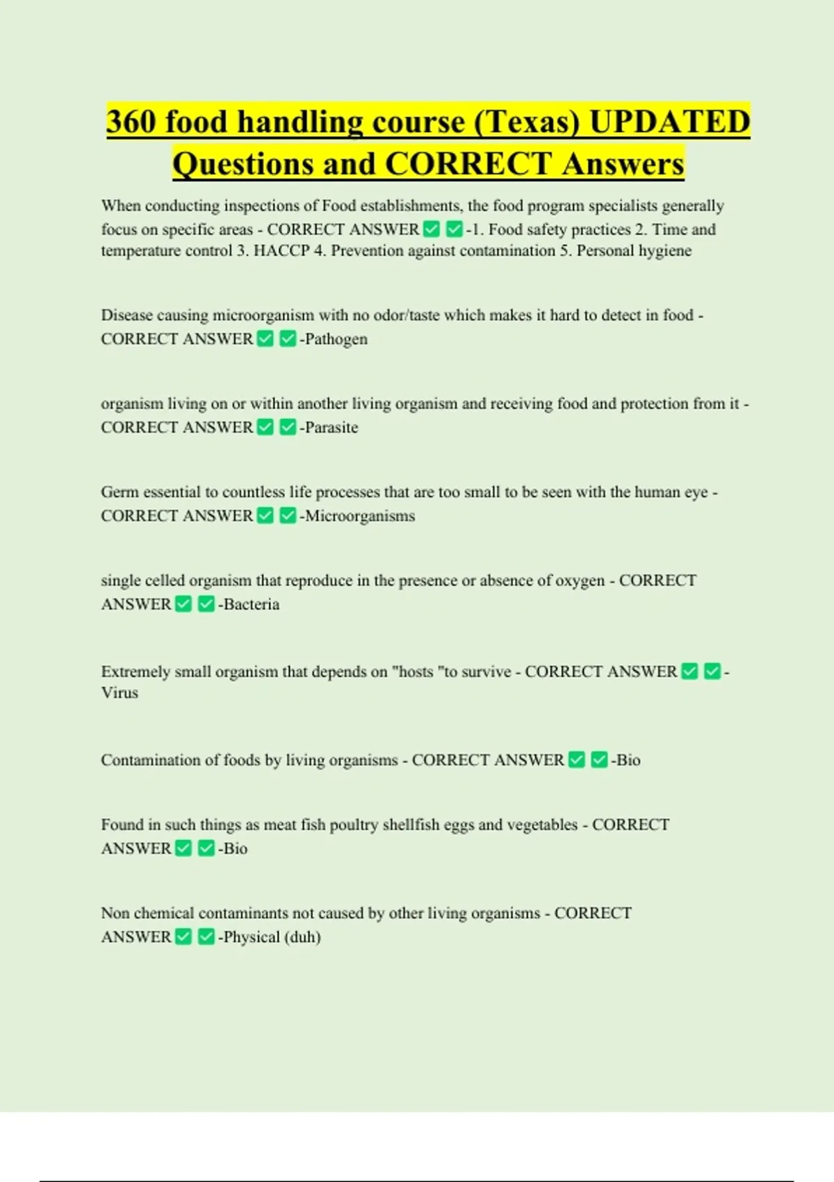360 food handling course (Texas) UPDATED Questions and CORRECT Answers