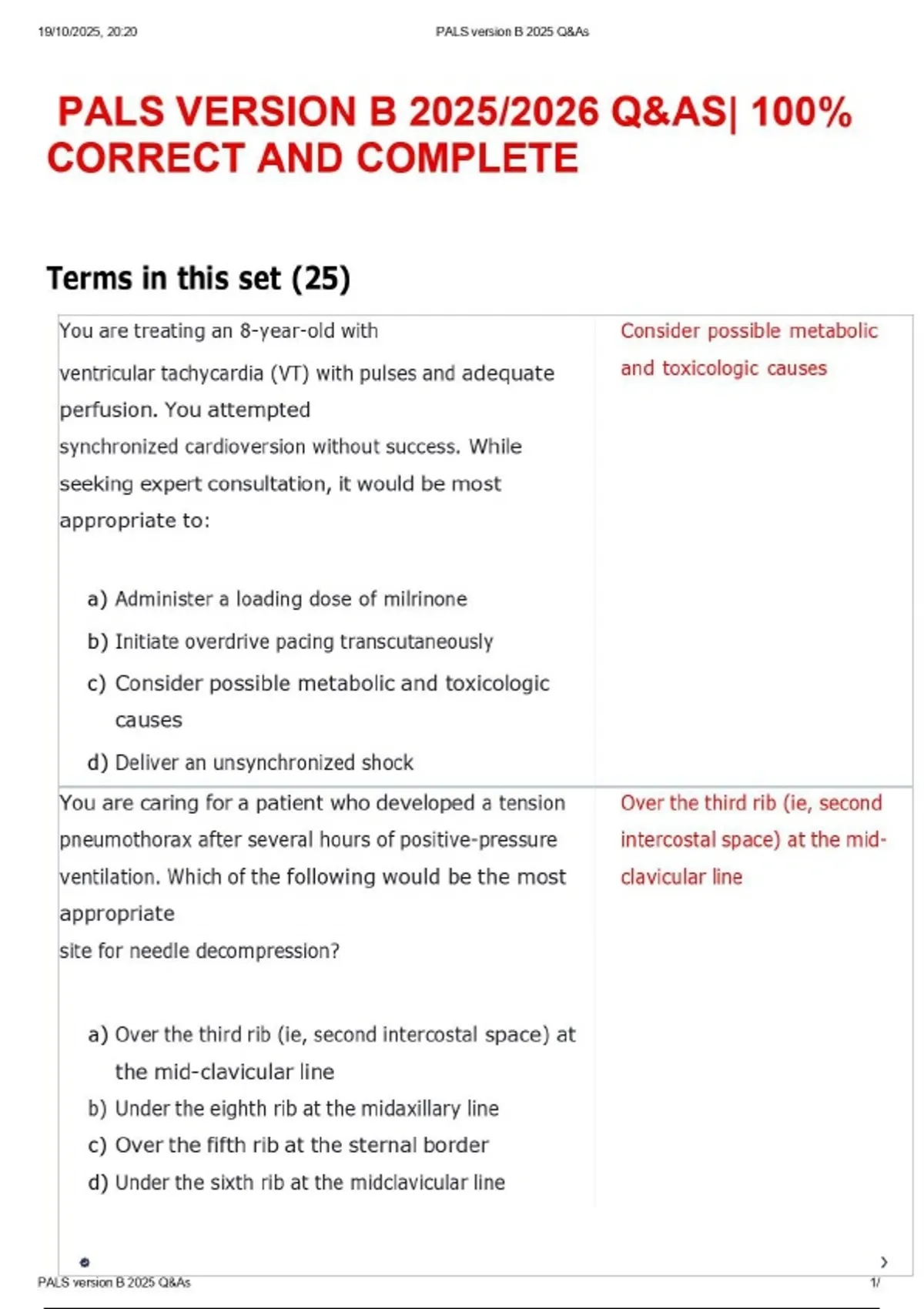 PALS VERSION B 2025/2026 Q&AS| 100% CORRECT AND COMPLETE
