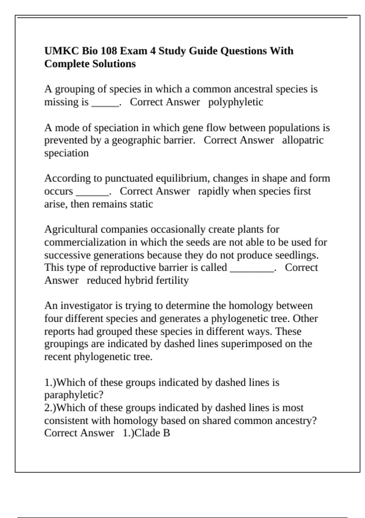 UMKC Bio 108 Exam 4 Study Guide Questions With Complete Solutions