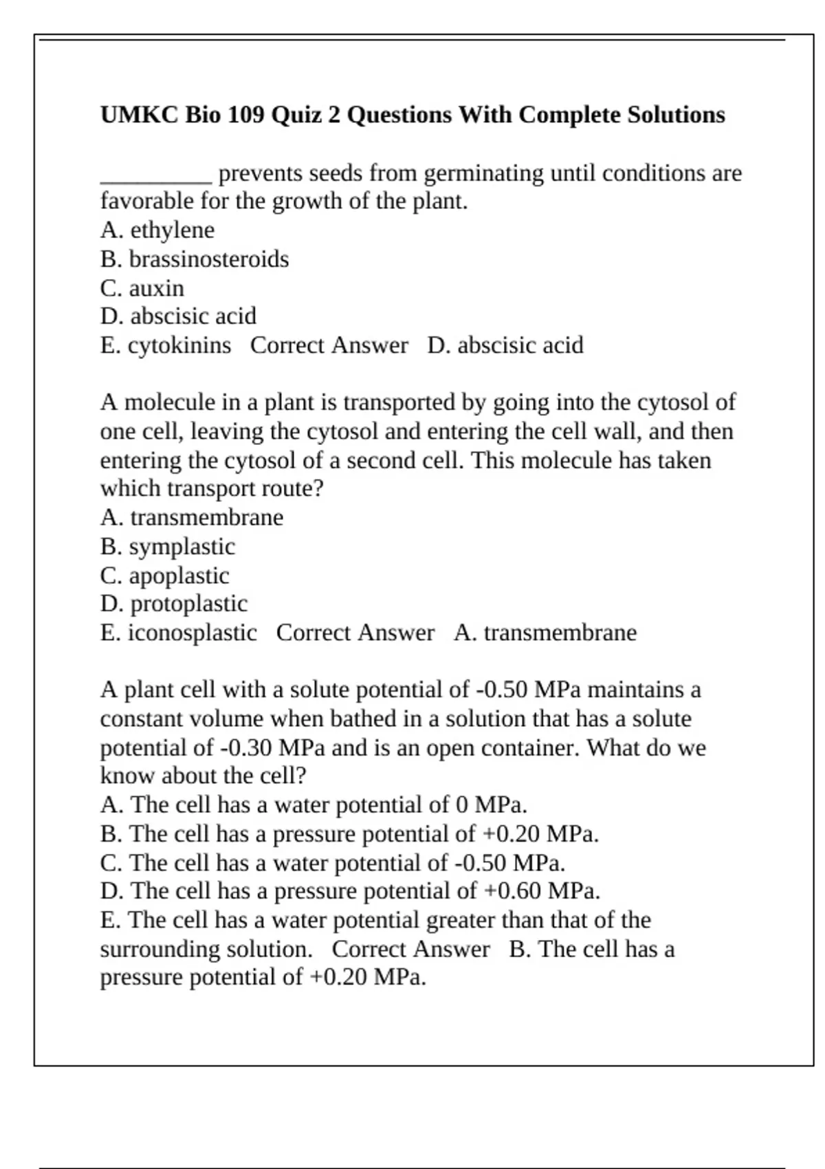 UMKC Bio 109 Quiz 2 Questions With Complete Solutions