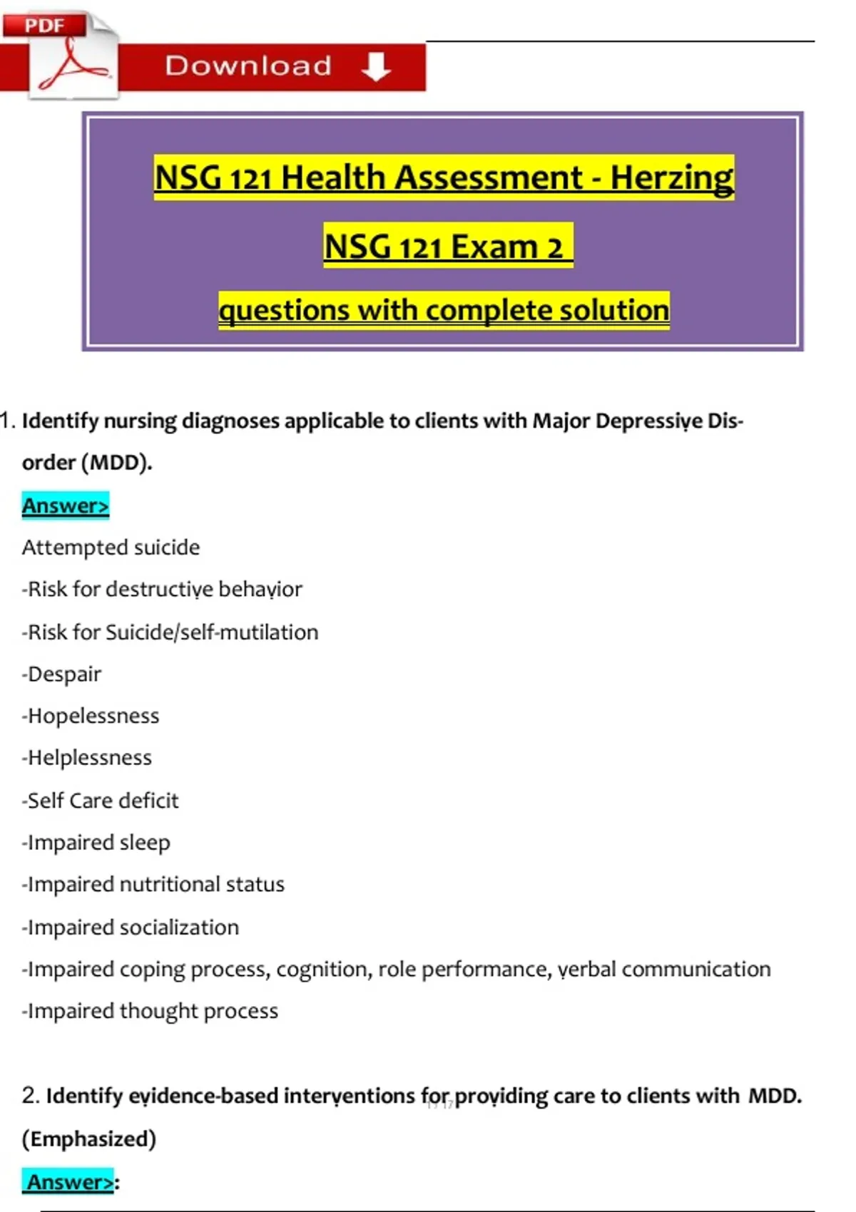 NSG 121 Health Assessment - Herzing NSG 121 Exam 2 questions with complete solution
